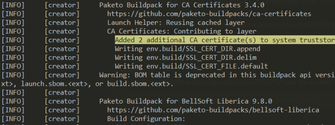 * [https://blog.dahanne.net/2021/02/06/customizing-cloud-native-buildpacks-practical-examples/#Add\_certificates\_binding\_at\_runtime:\~:text=ca%2Dcertificates-,Add%20certificates%20binding%20at%20runtime,-If%20your%20image](https://blog.dahanne.net/2021/02/06/customizing-cloud-native-buildpacks-practical-examples/#Add_certificates_binding_at_runtime)