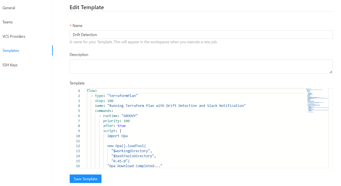 Now that you have define the template to detect the infraestructure drif you can add the template in your Terrakube organization using the name "Drift Detection"