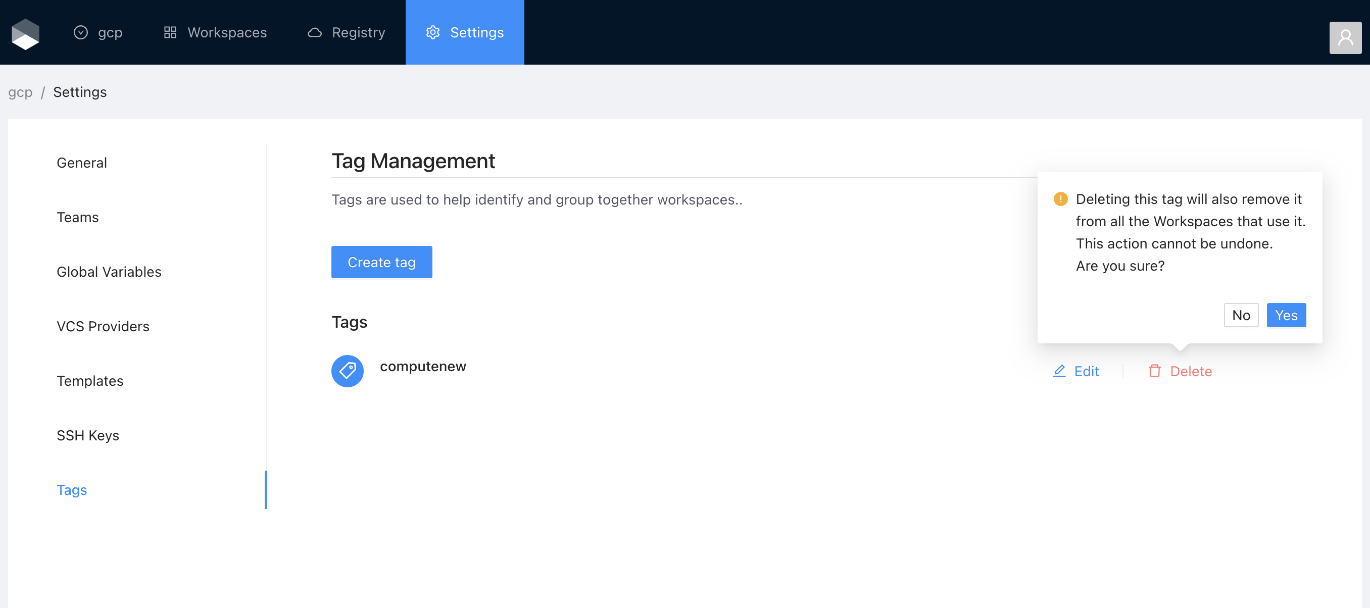 Click the **Delete** button next to the tag you want to delete, and then click the Yes button to confirm the deletion. Please take in consideration the deletion is irreversible and the tag will be removed from all the workspaces using it.