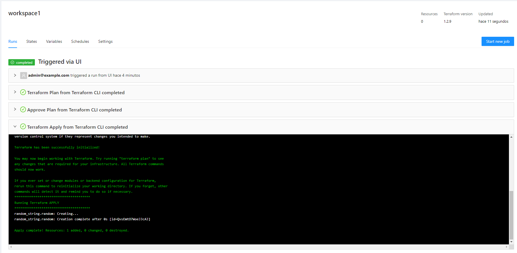 You can initiate runs with the usual terraform plan and terraform apply commands and then monitor the run progress from your terminal. These runs run remotely in Terrakube.
