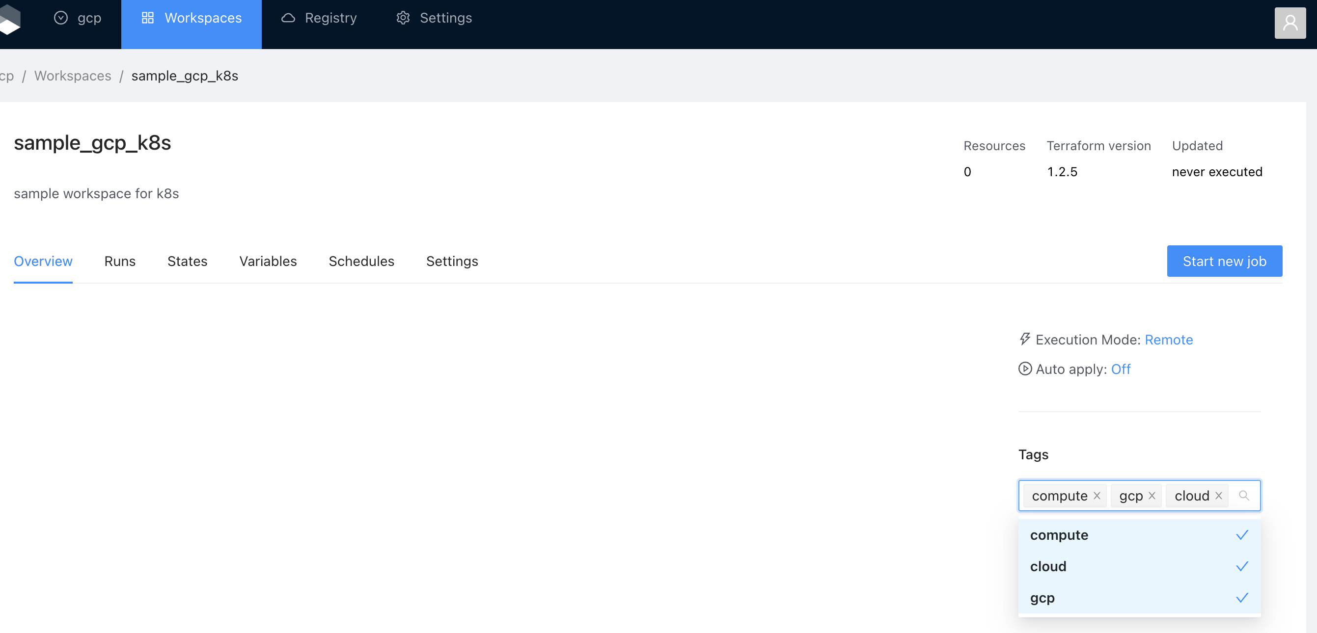 You can manage tags for the workspace in the overview page. The right panel lets you search existing tags or type a new tag name to add or remove tags from the workspace.