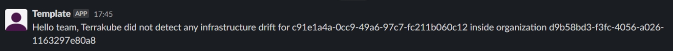 "Hello team, Terrakube did not detect any infrastructure drift for workspace $workspaceId inside organization $organizationId",