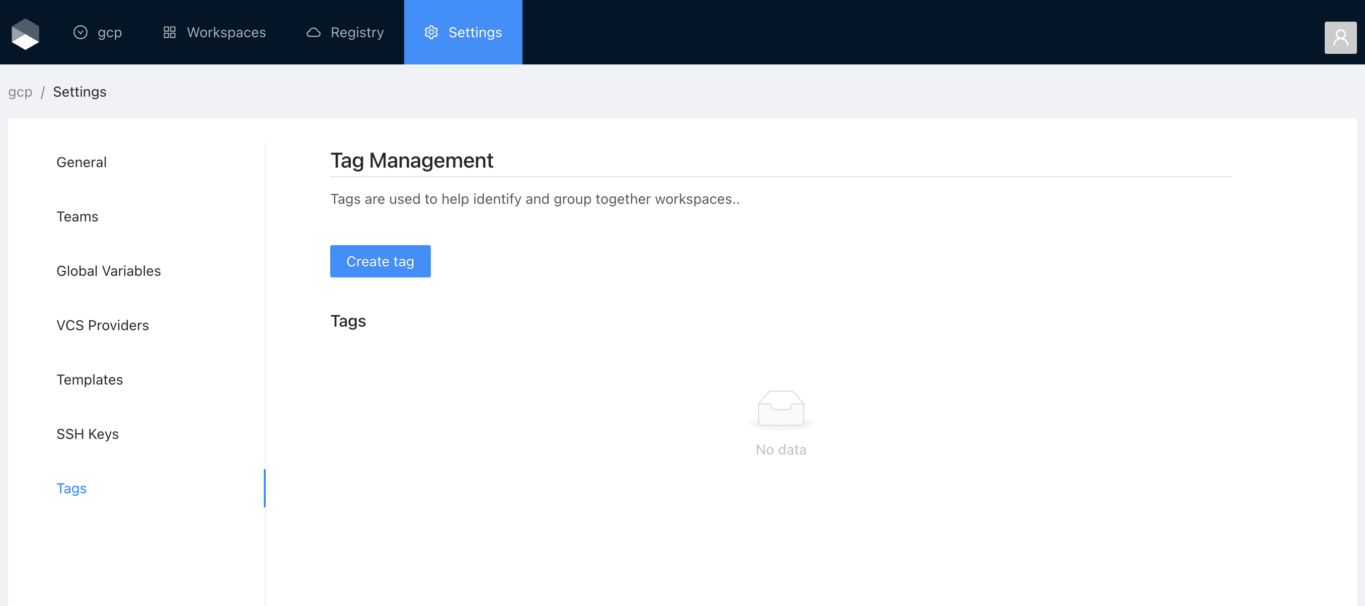 You can manage tags for the organization in the Settings panel. This section lets you create and remove tags. Alternatively, you can add existing tags or create new ones in the [Workspace overview page](https://docs.terrakube.io/2.19.0/user-guide/workspaces/overview).