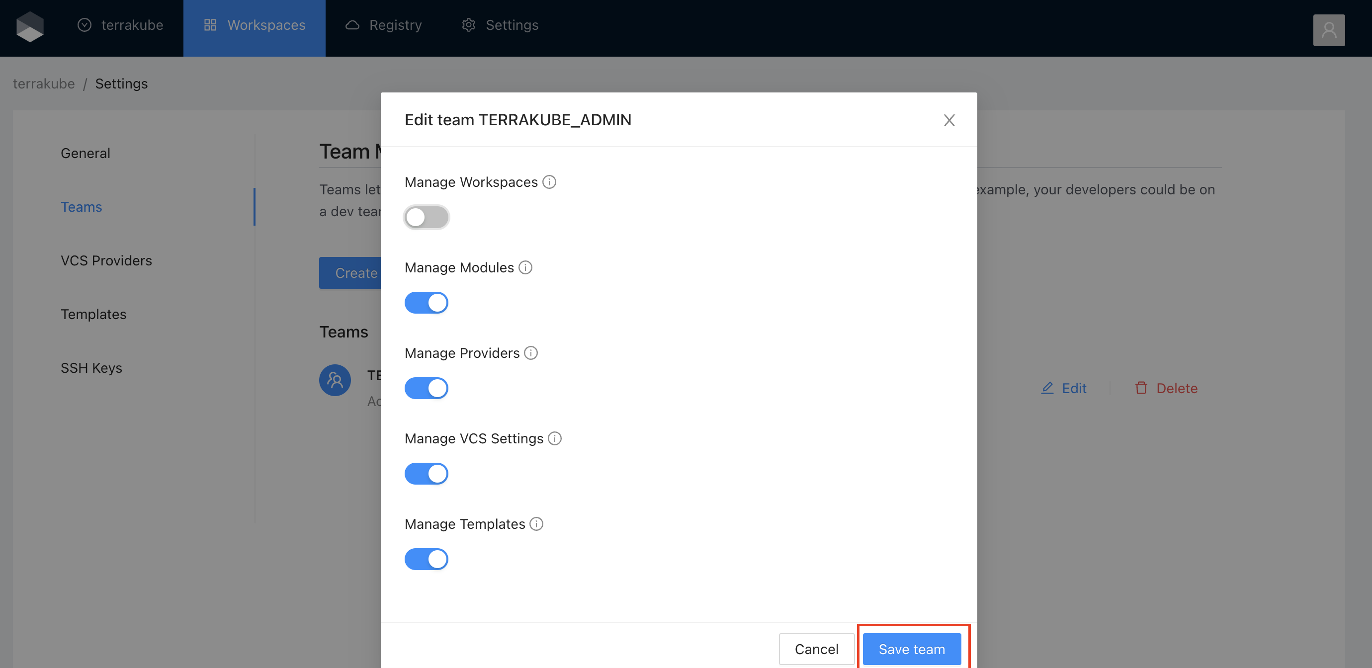 Change the permissions you need and click the **Save team** button