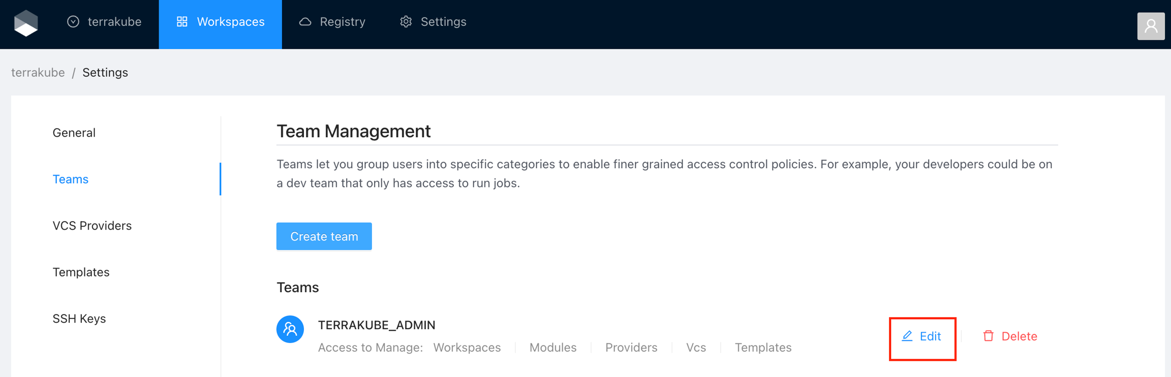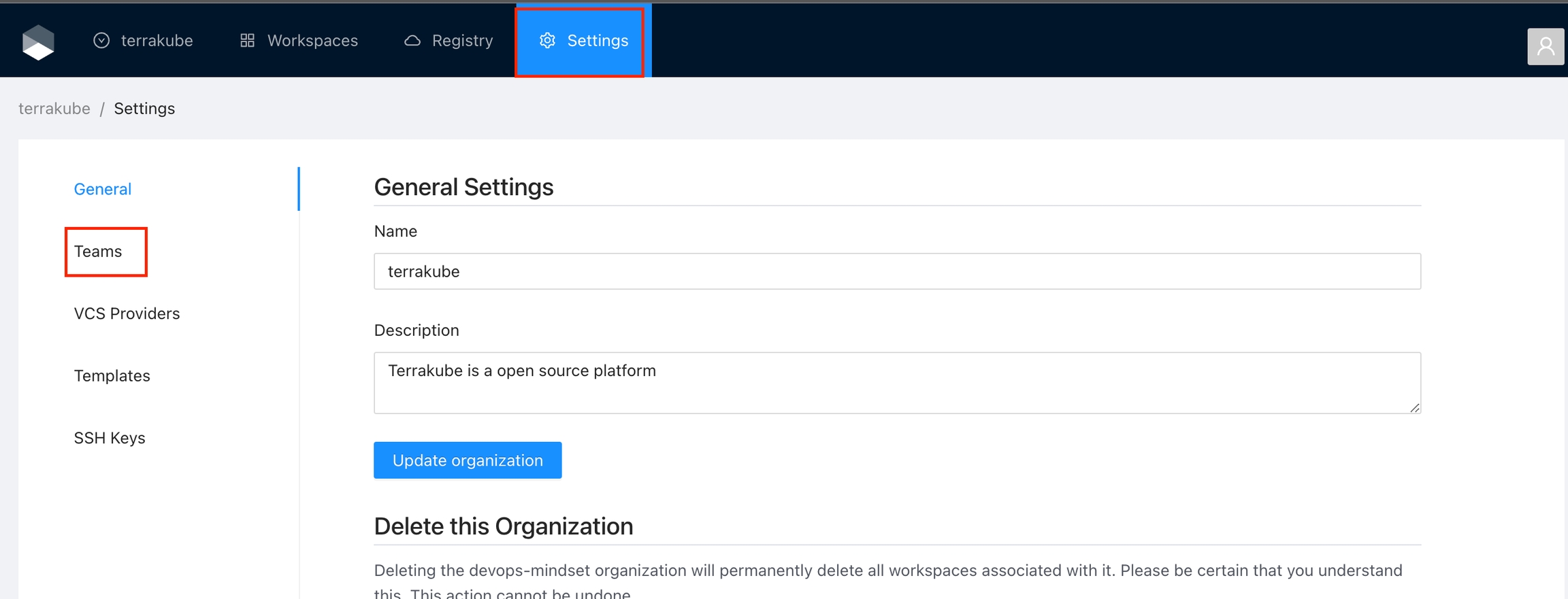 Once you are in the desired organization, click the Settings button and then in the left menu select the Teams option.