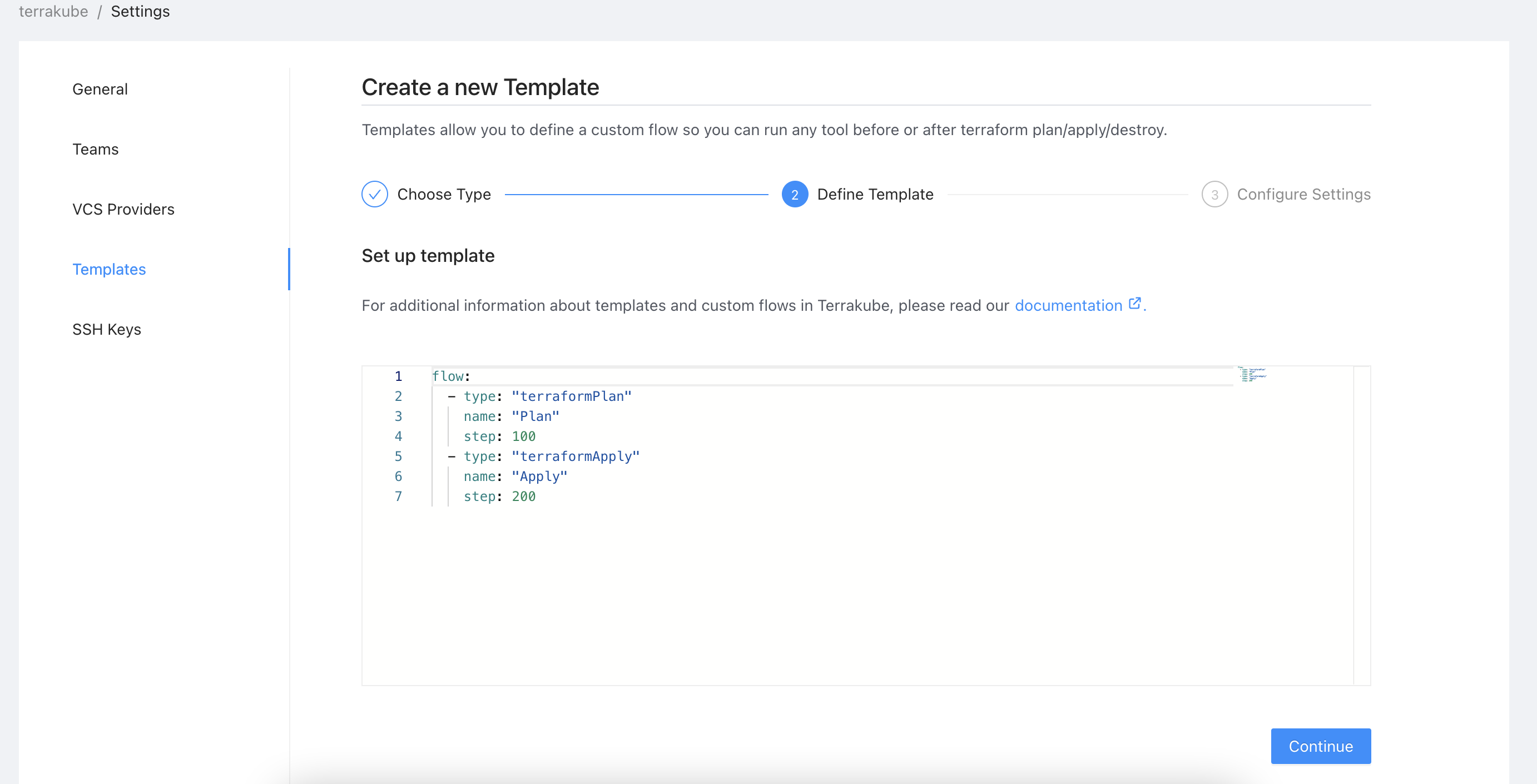 Templates allows you to customize the job workflow inside each workspace. You can define multiple templates inside each organization. Templates are written in yaml and you can specify each step to be executed once you use this template in the workspace. Lets see an example for a basic template: