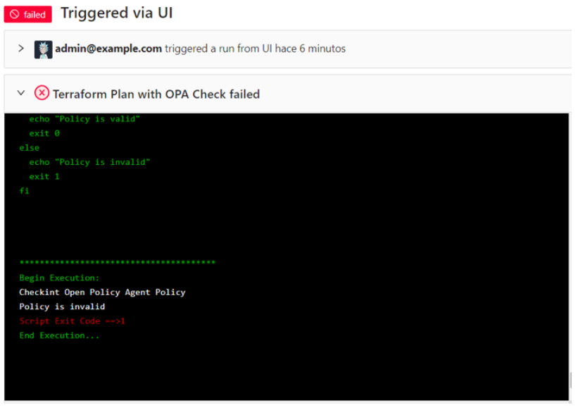 When you run this Terrakube job for this particular workspace you will see that the terraform policy is invalid and the job flow will failed.