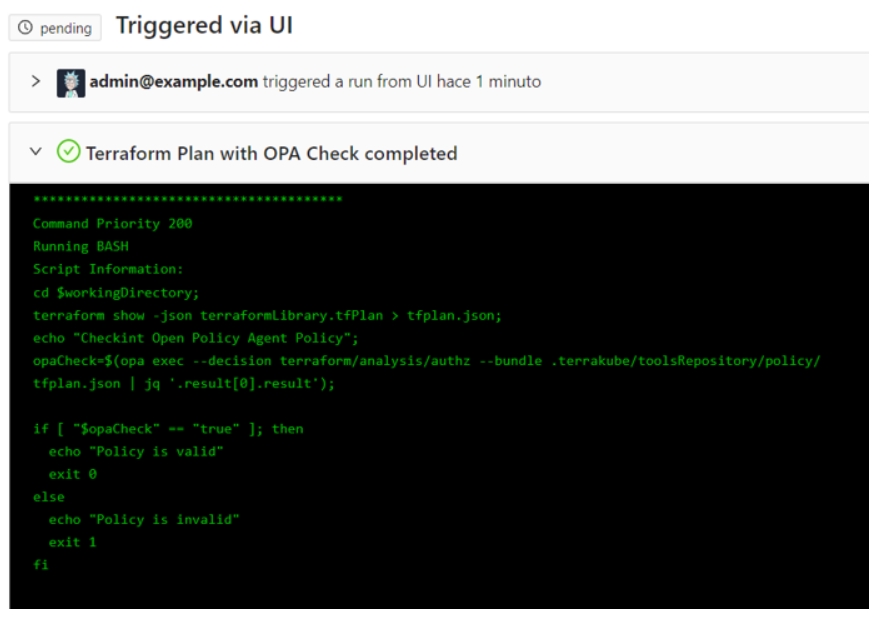 Once the Open Policy Agent has been imported successfully inside our Terrakube Job, you can make use of it to validate different terraform policies defined inside the Terrakube extensions repository that gets imported inside our workspace job using a simple BASH script. Based on the result of the policy you can difine if the job flow can continue or not.