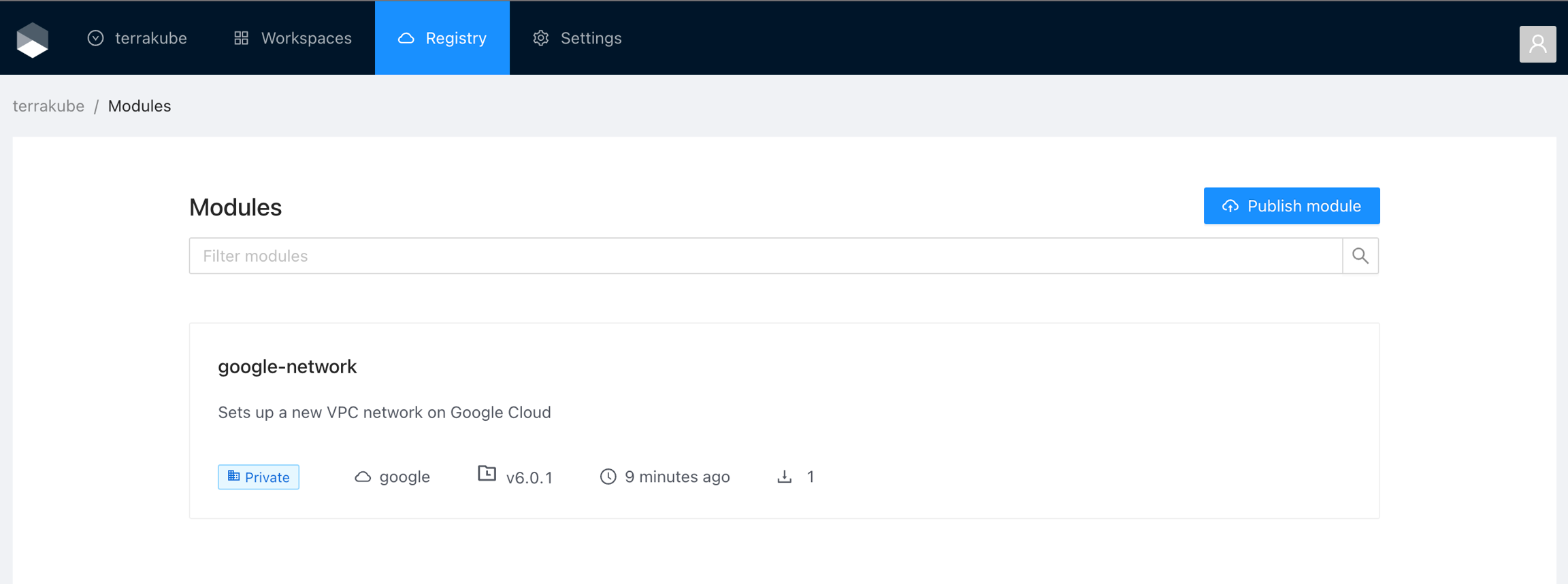 All users in an organization with Manage Modules permission can view the Terrakube private registry and use the available providers and modules.