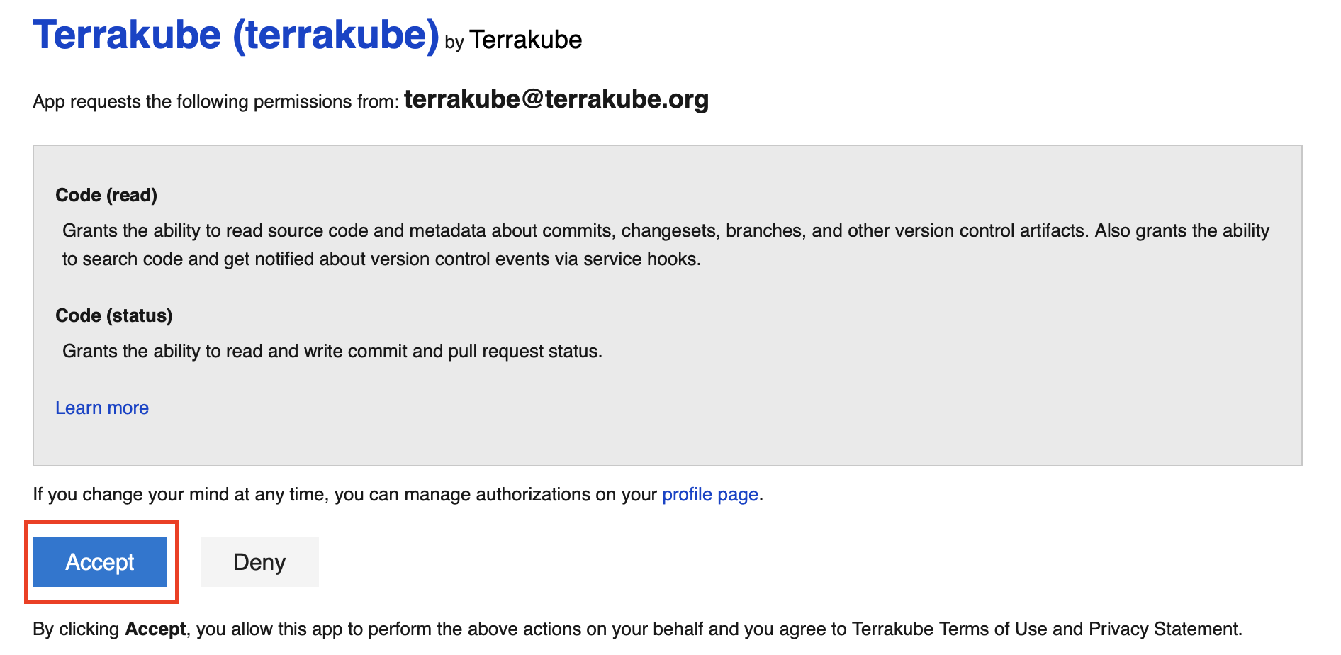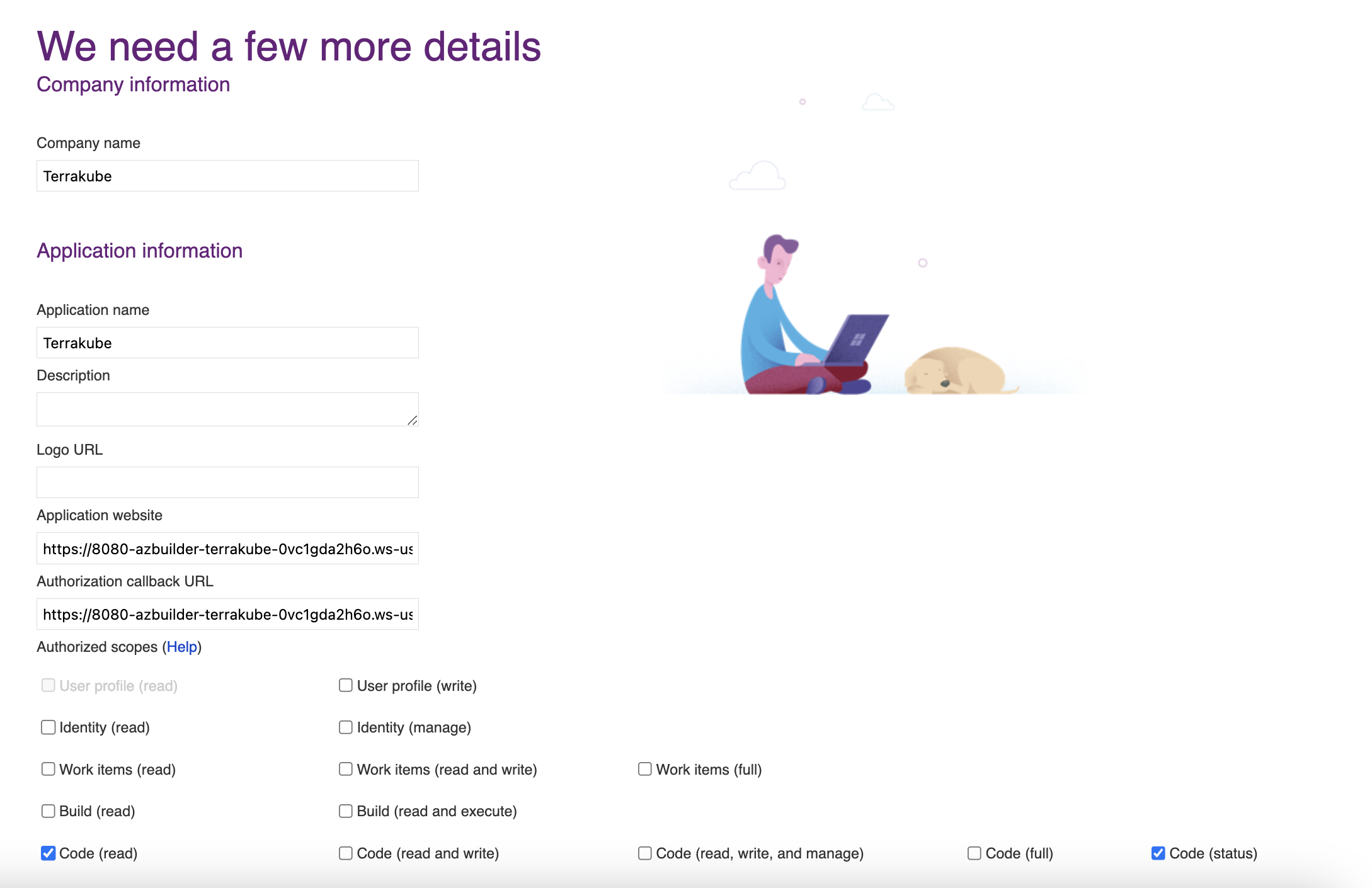 <table><thead><tr><th width="354">Field</th><th>Description</th></tr></thead><tbody><tr><td>Company Name </td><td>Your company name.</td></tr><tr><td>Application name</td><td>The name of your application or you can use the Organization name</td></tr><tr><td>Application website</td><td>Your application or website url </td></tr><tr><td>Callback URL</td><td>Copy the Callback URL from the Terrakube URL</td></tr><tr><td>Authorized scopes (checkboxes)</td><td>Only the following should be checked: Code (read) Code (status)</td></tr></tbody></table>