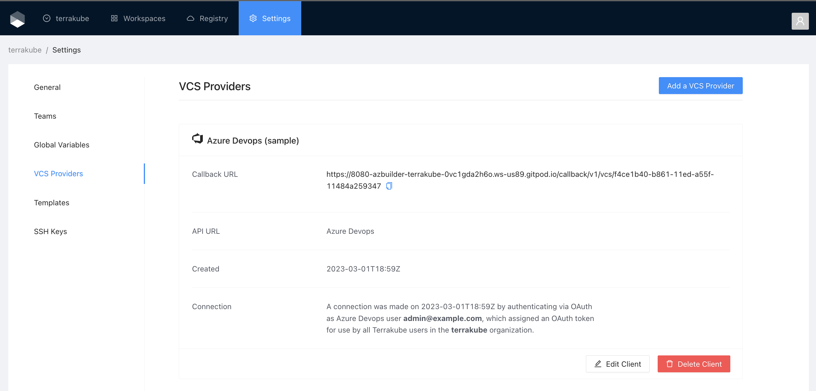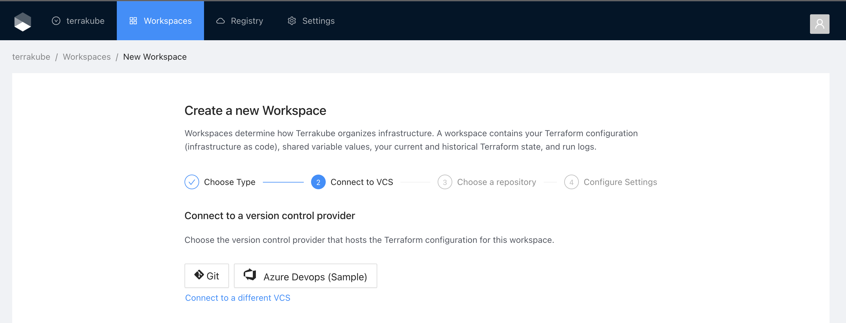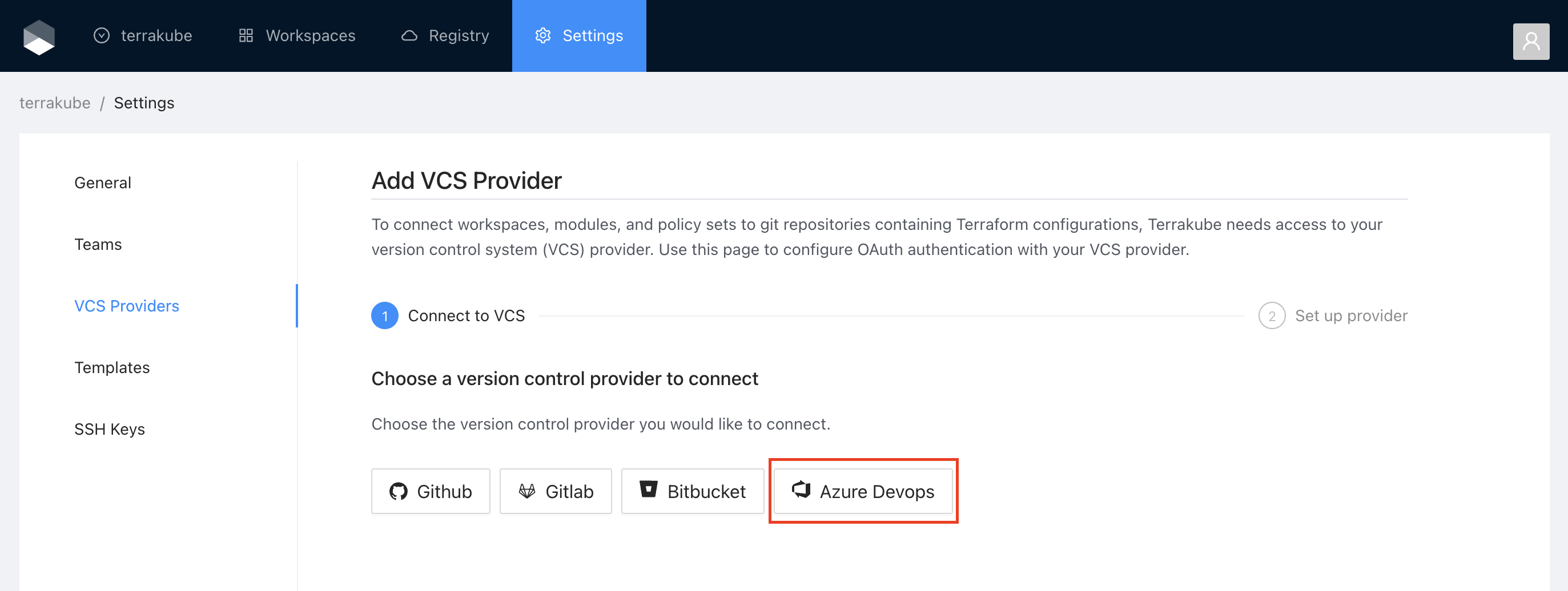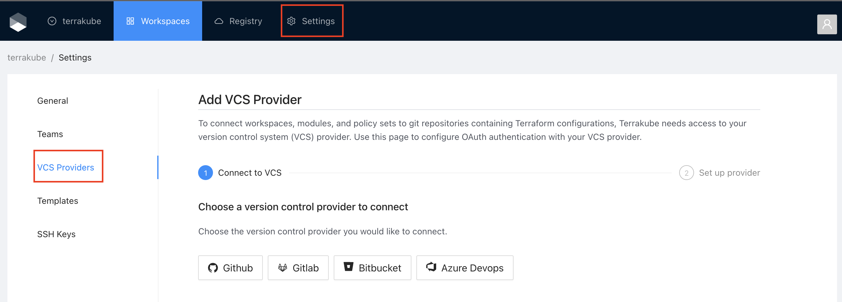 If you prefer, you can add a new VCS Provider directly from the [Create workspace](https://docs.terrakube.io/2.19.0/user-guide/workspaces/creating-workspaces) or Create Module screen.