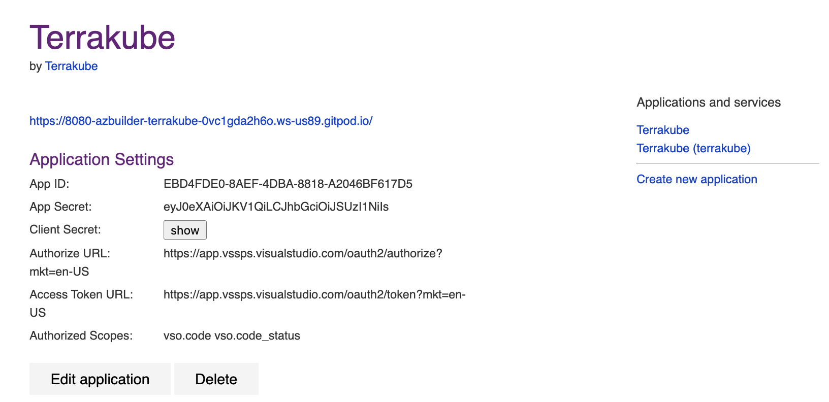 In the Azure Devops page, complete the required fields and click **Create application**