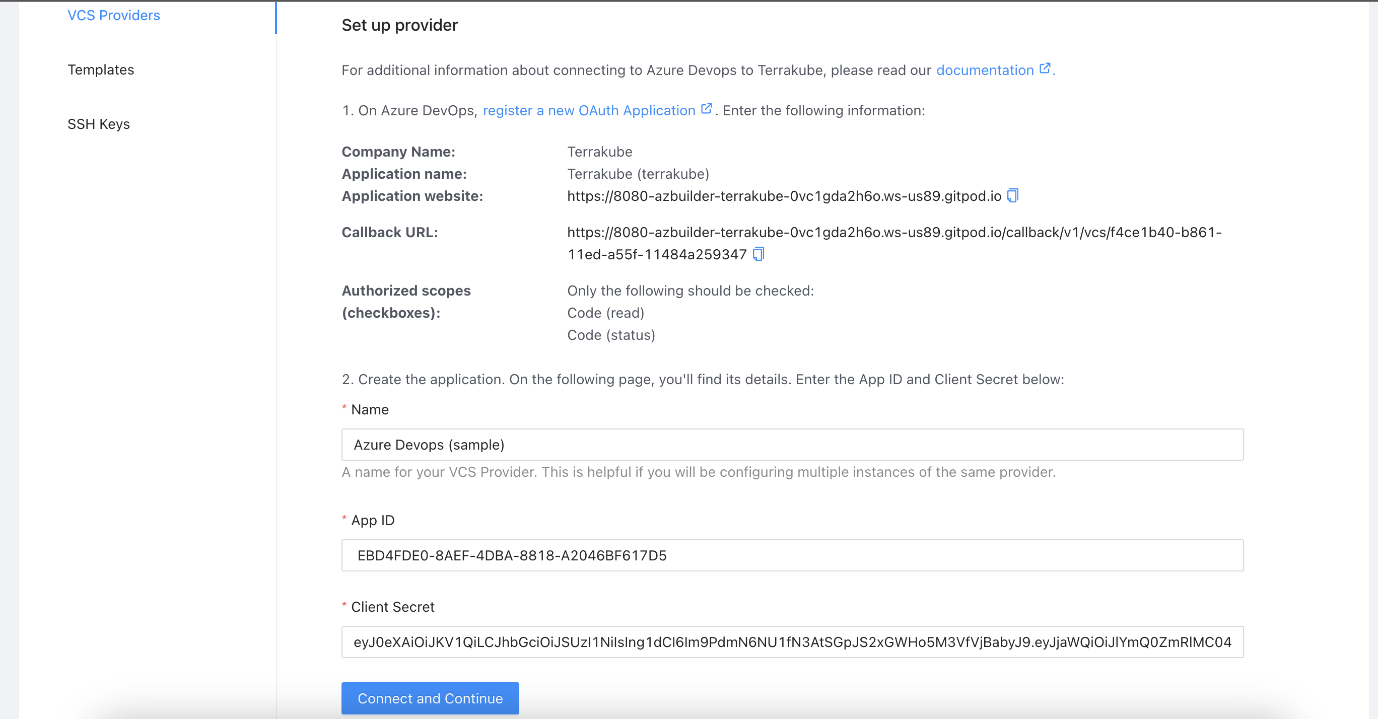 Go back to Terrakube to enter the information you copied from the previous step. Then, click the **Connect and Continue** button.