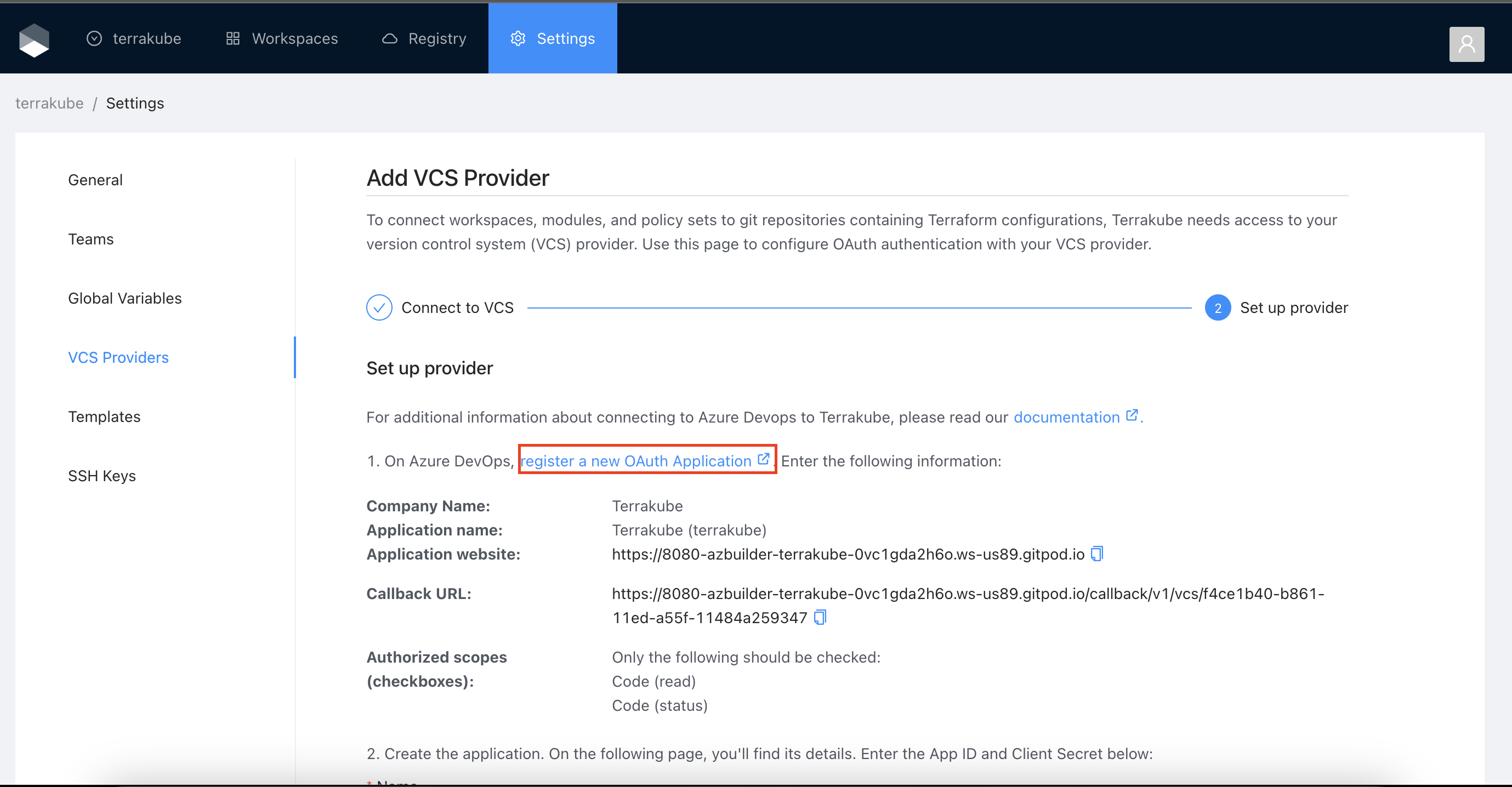 You can complete the fields using the information suggested by terrakube in the VCS provider screen
