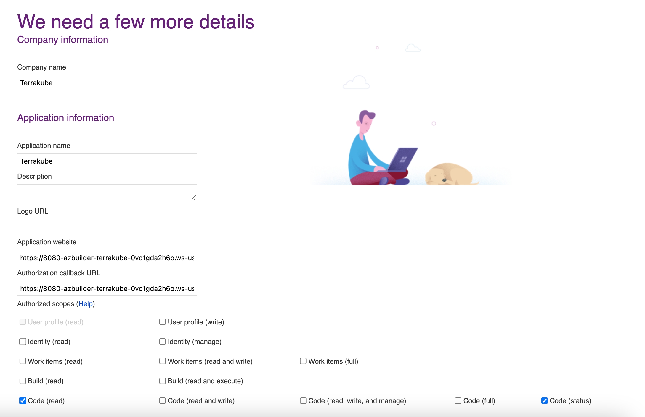 In the next screen click the link to register a new OAuth Application in Azure Devops
