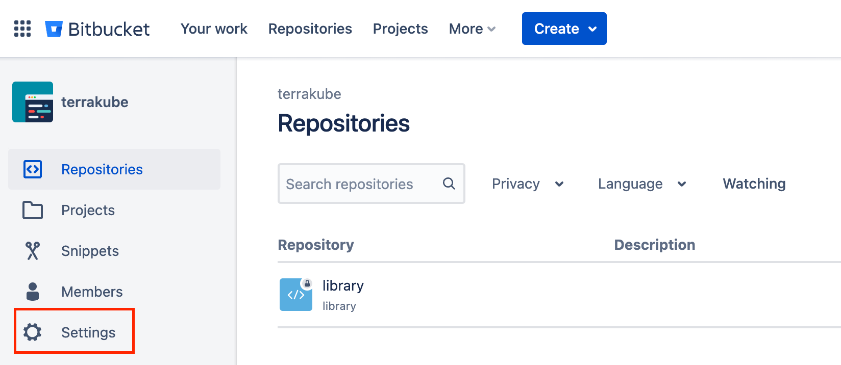 Open Bitbucket Cloud and log in as whichever account you want Terrakube to use and click the settings button in your workspace