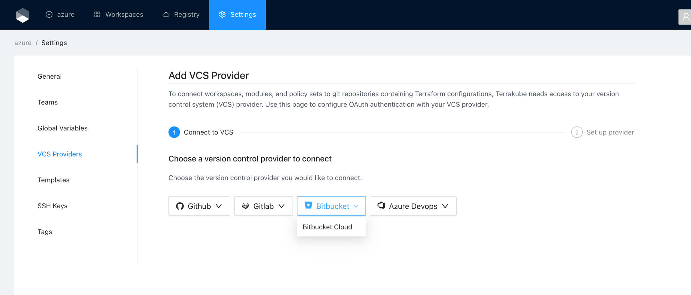 If you prefer, you can add a new VCS Provider directly from the Create workspace or Create Module screen.