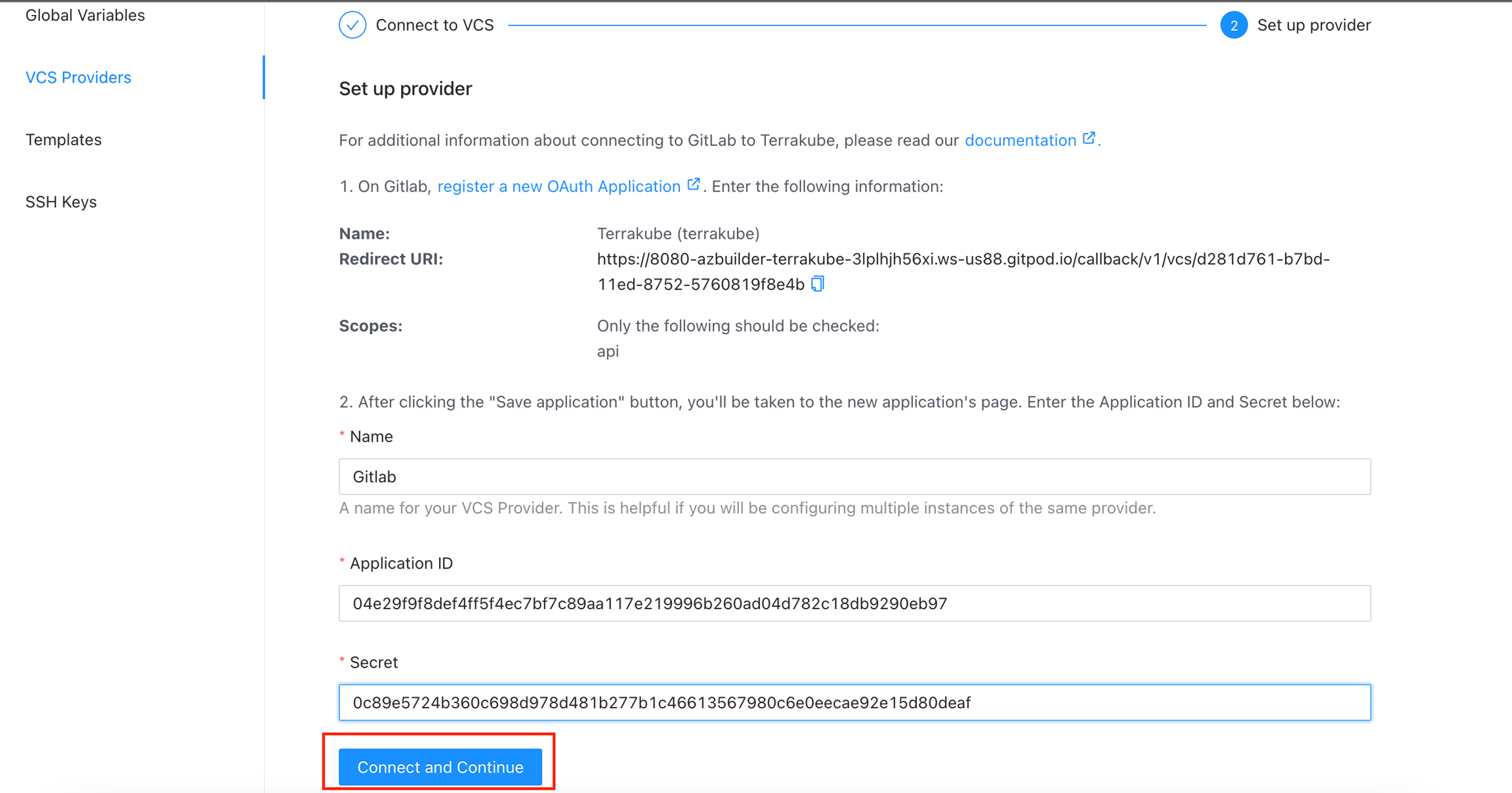 Go back to Terrakube to enter the information you copied from the previous step. Then, click the Connect and Continue button.