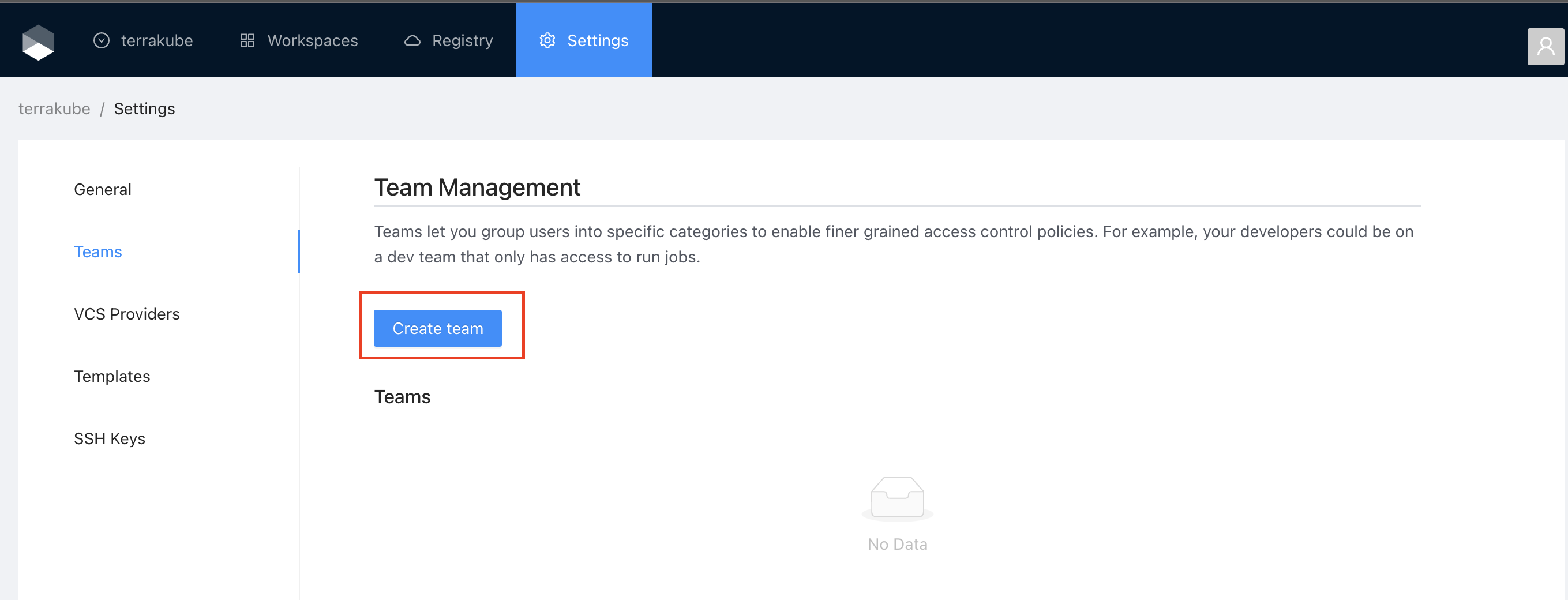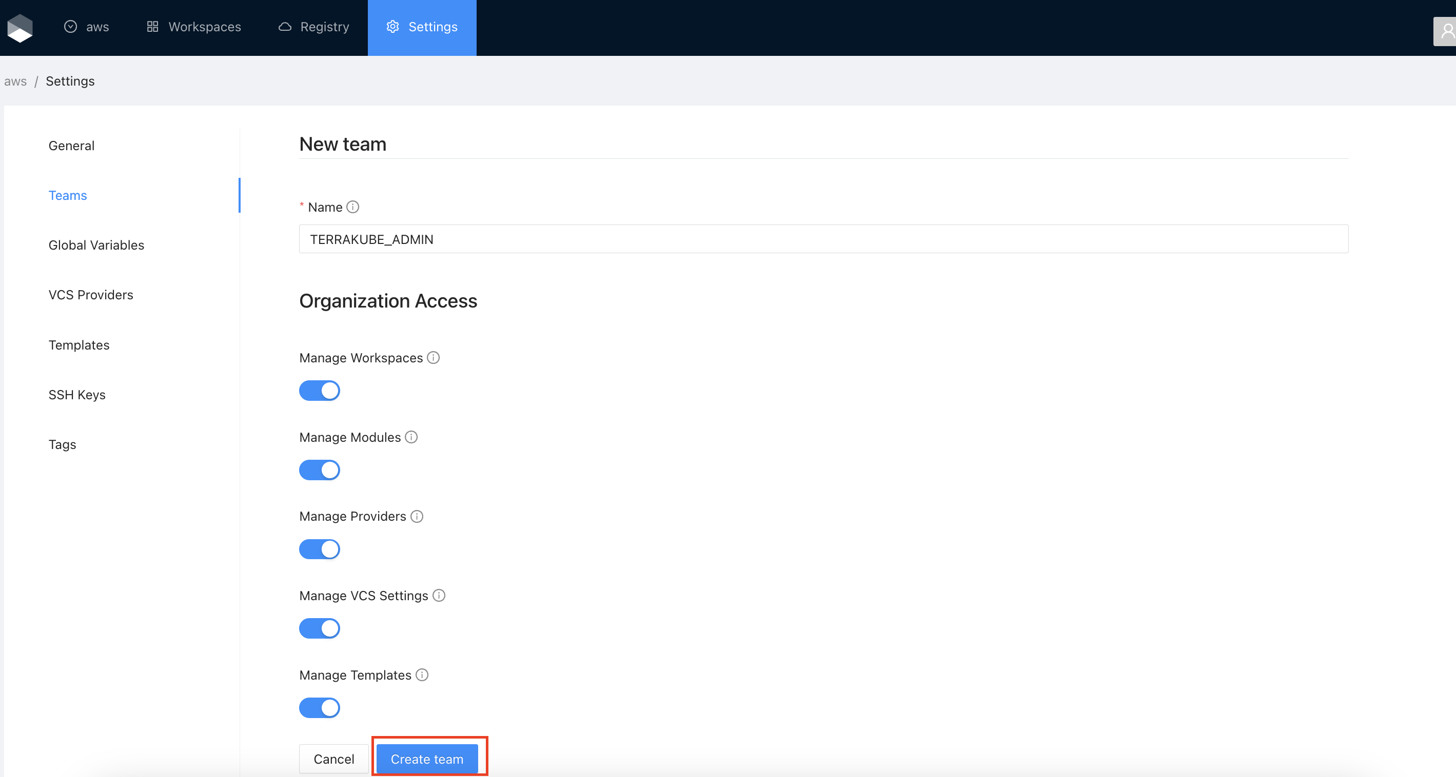 <table><thead><tr><th width="341">Field</th><th>Description</th></tr></thead><tbody><tr><td>Name</td><td><p>Must be a valid group based on the Dex connector you are using to manage users and groups.</p><p>For example if you are using Azure Active Directory, you must use a valid Active Directory Group like TERRAKUBE_ADMIN, or if you are using Github the format should be MyGithubOrg:TERRAKUBE_ADMIN</p></td></tr><tr><td>Manage Workspaces</td><td>Allow members to create and administrate all workspaces within the organization</td></tr><tr><td>Manage Modules</td><td>Allow members to create and administrate all modules within the organization</td></tr><tr><td>Manage Providers</td><td>Allow members to create and administrate all providers within the organization</td></tr><tr><td>Manage <a href="templates">Templates</a></td><td>Allow members to create and administrate all <a href="templates">templates</a> within the organization</td></tr><tr><td>Manage <a href="../vcs-providers">VCS Settings</a></td><td>Allow members to create and administrate all <a href="../vcs-providers">VCS Providers</a> within the organization</td></tr></tbody></table>