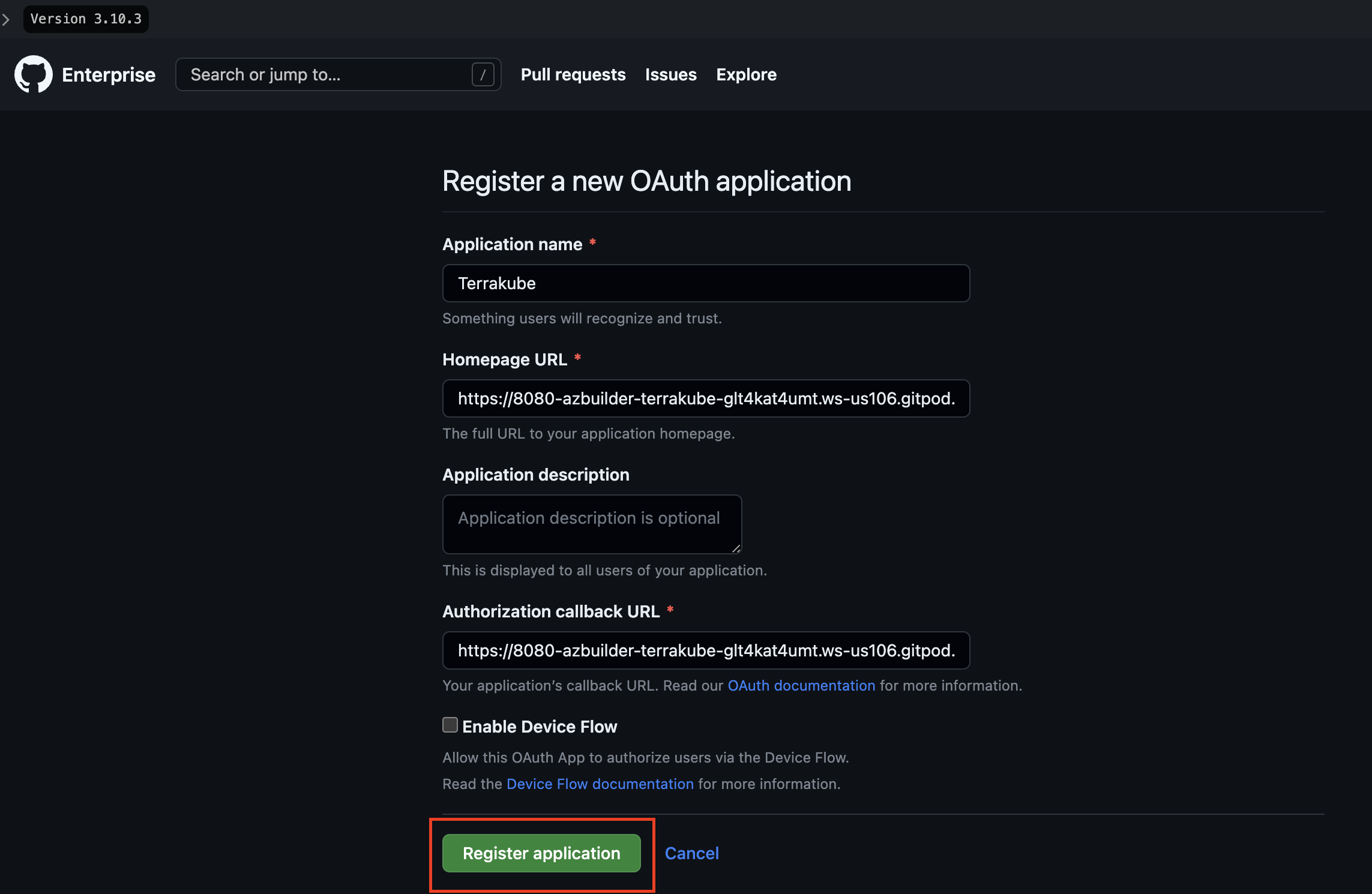* In the Github Enterprise page, complete the required fields and click **Register application**
