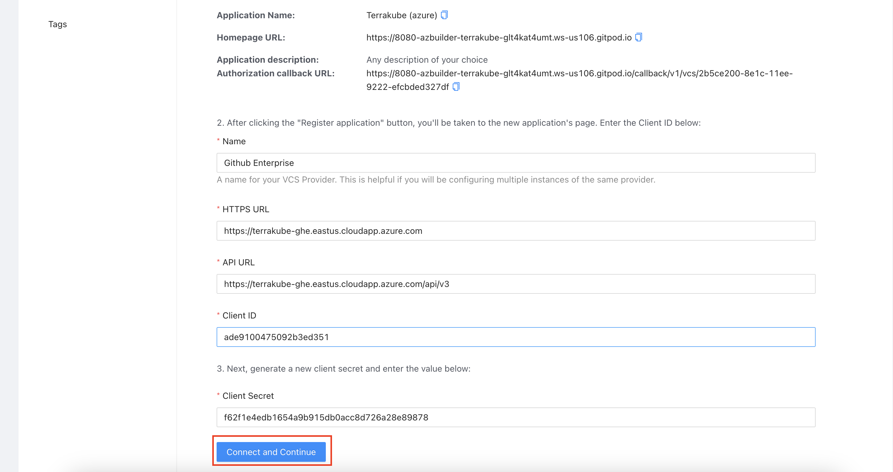 Copy the **Client Id** and **Client Secret** from Github Enterprise and go back to Terrakube to complete the required information. Then, click the **Connect and Continue** button