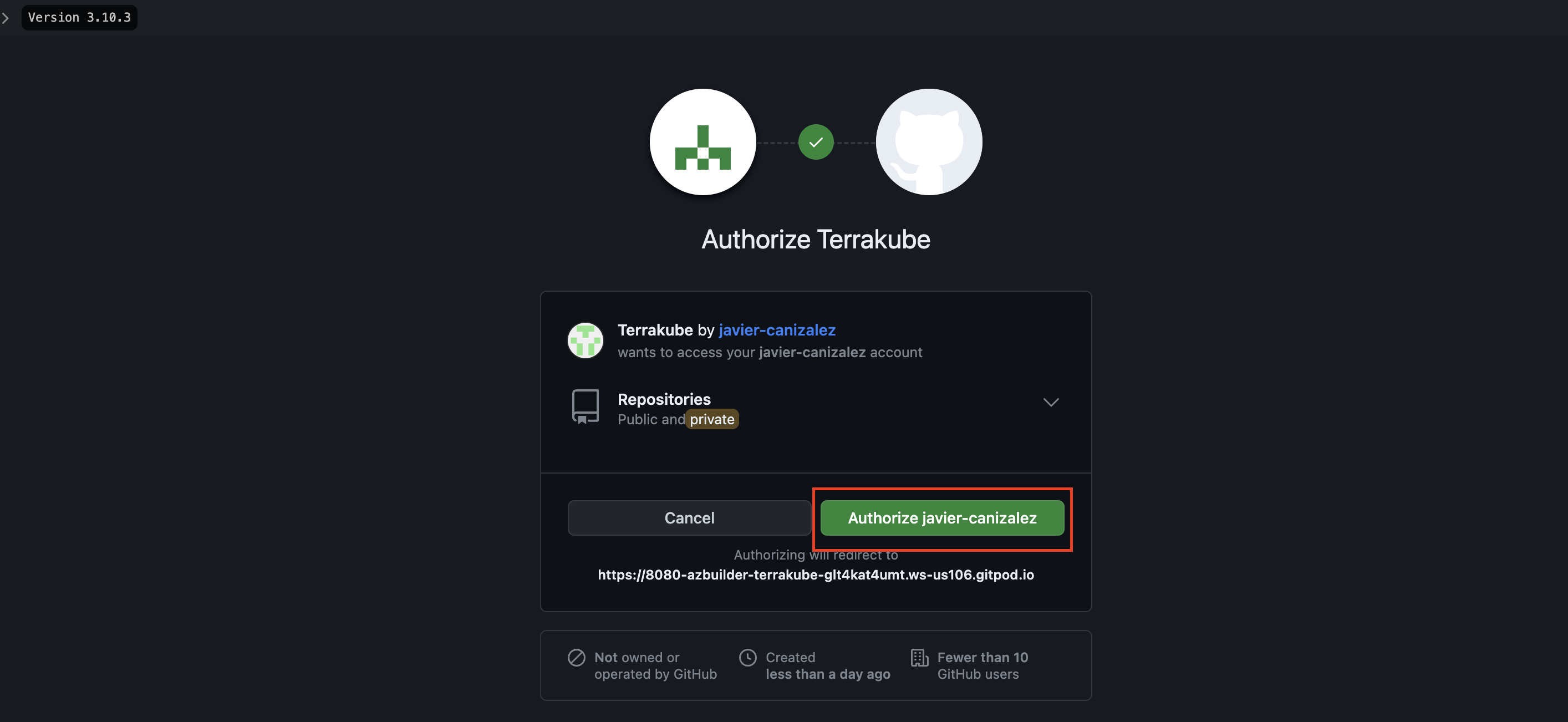 * Use a different browser tab to access your GitHub Enterprise instance and sign in with the account that you want Terrakube to use. You should use a service user account for your organization, but you can also use a personal account.