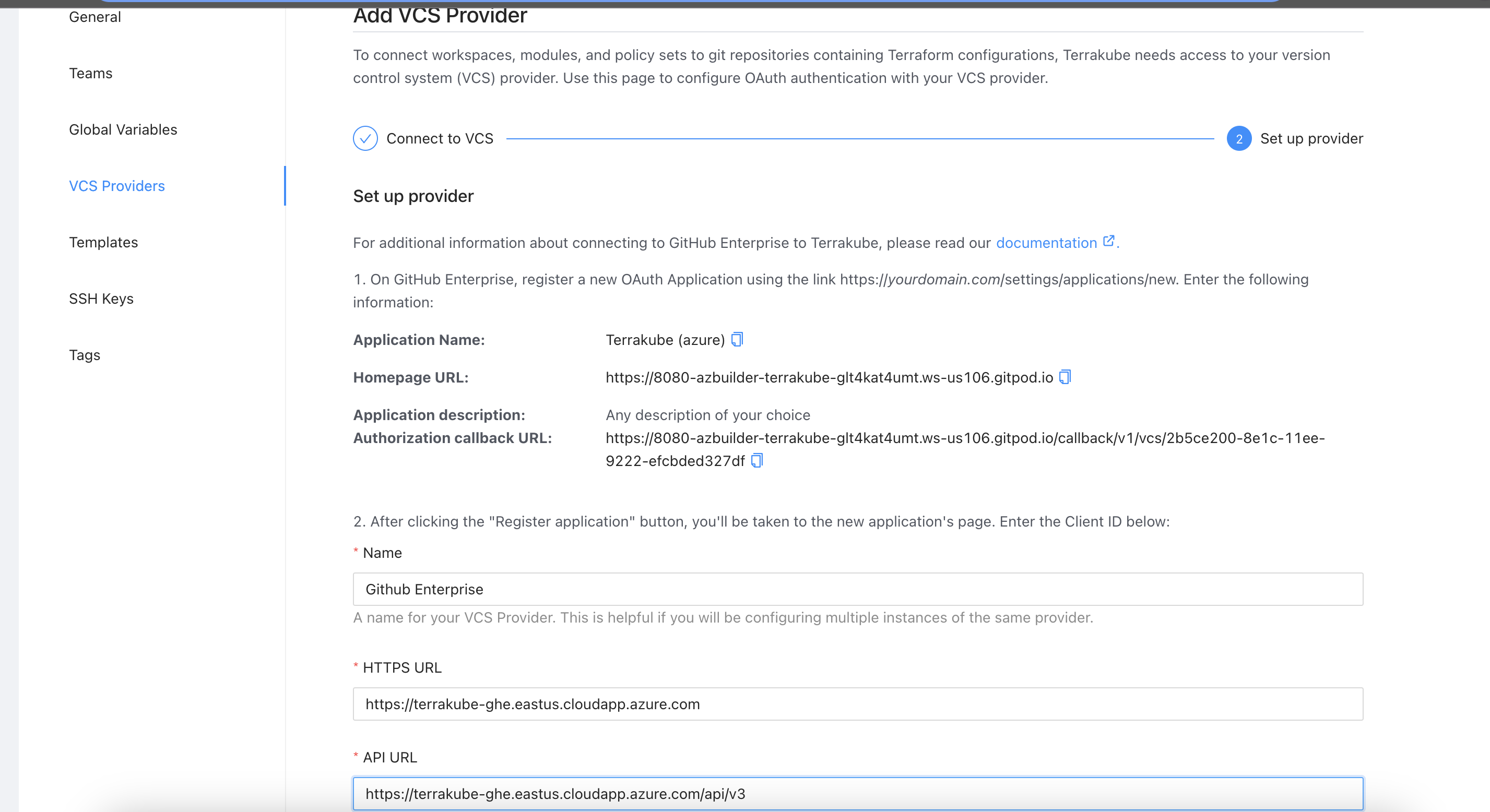 You can complete the fields using the information suggested by terrakube in the VCS provider screen