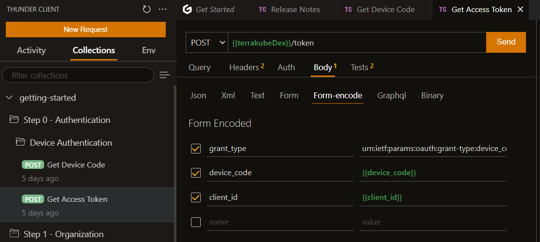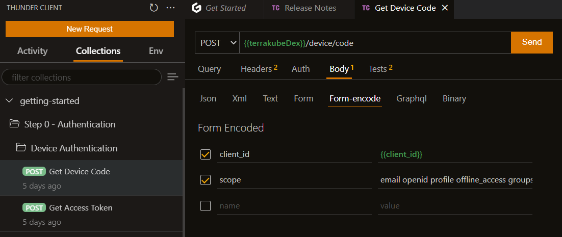 To authenticate the thunder client you can use Dex Device Code Authentication using the following request