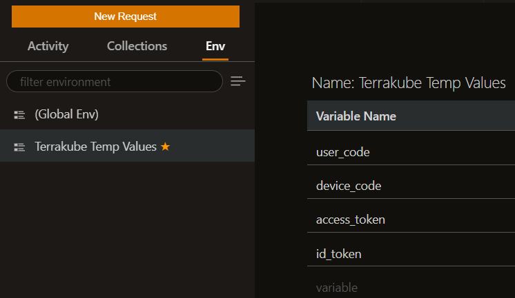 All the environment variables for the collection are generated on each Gitpod workspace startup The environment variables template can be found in the following directory: