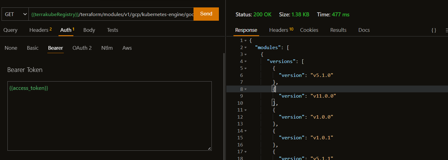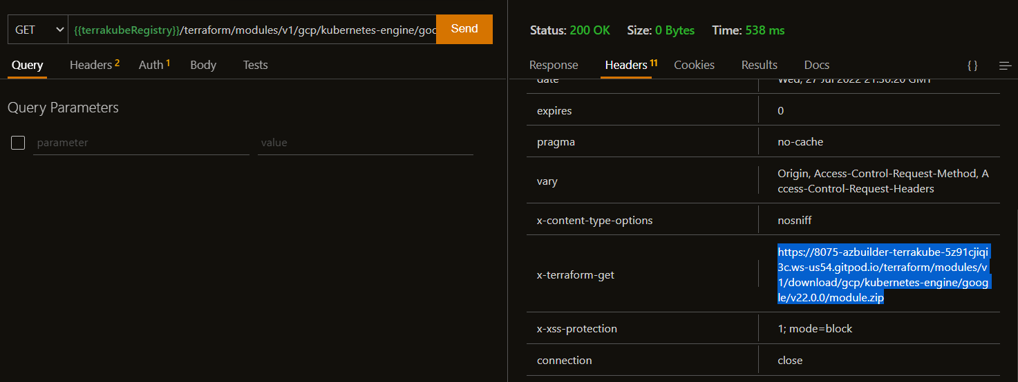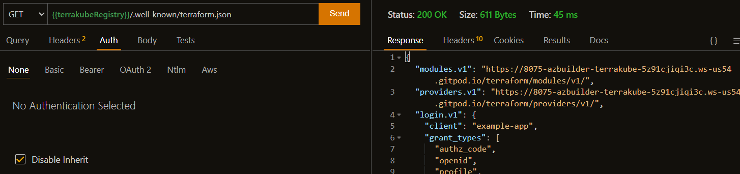 There is one example of terraform module protocol inside the thunder-client collection that you can be used for testing purposes executing the following two request.