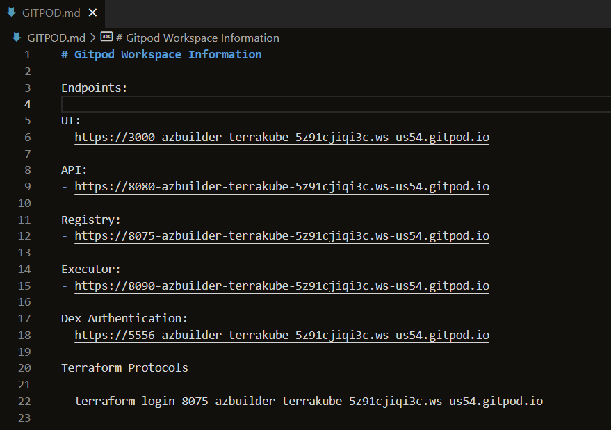 A file called GITPOD.md will have the information for the entire workspace