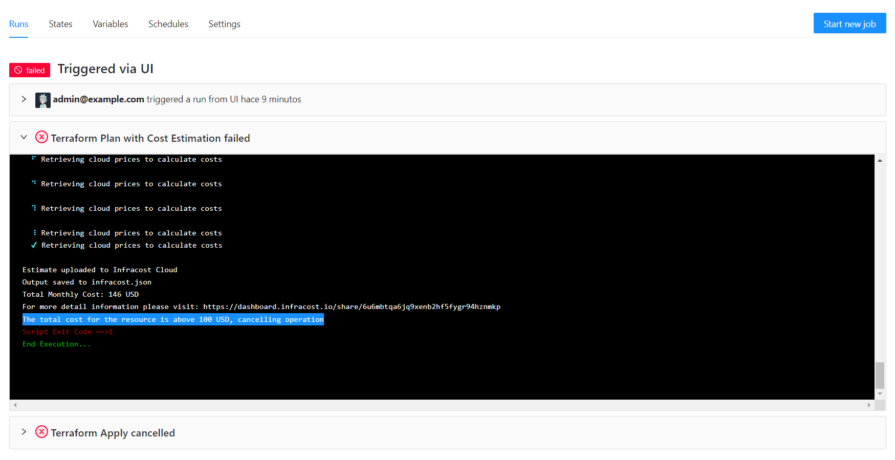 Now you can run the workspace again and the deployment will fail because it does not comply with the max cost of 100 USD every month, that you defined in the Terrakube template.