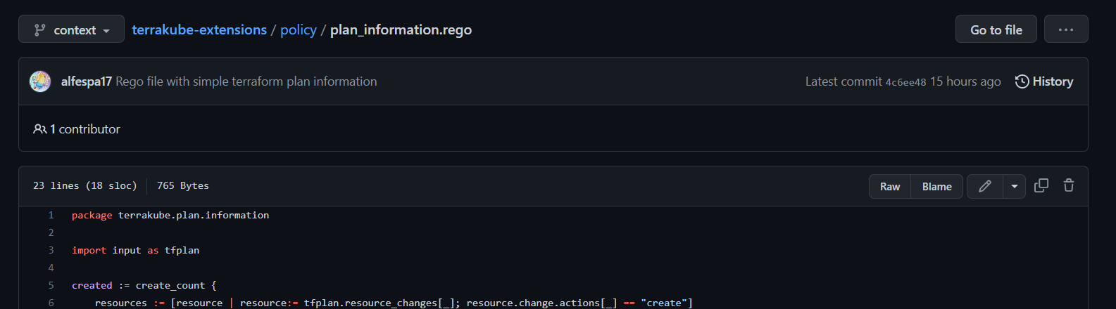 The firts step will be to create a small rego policy and add this to your Terrakube extensions repository inside the "policy" folder with the name **"plan\_information.rego"**, this is a very simple policy that will count the number of changes for a terraform plan.