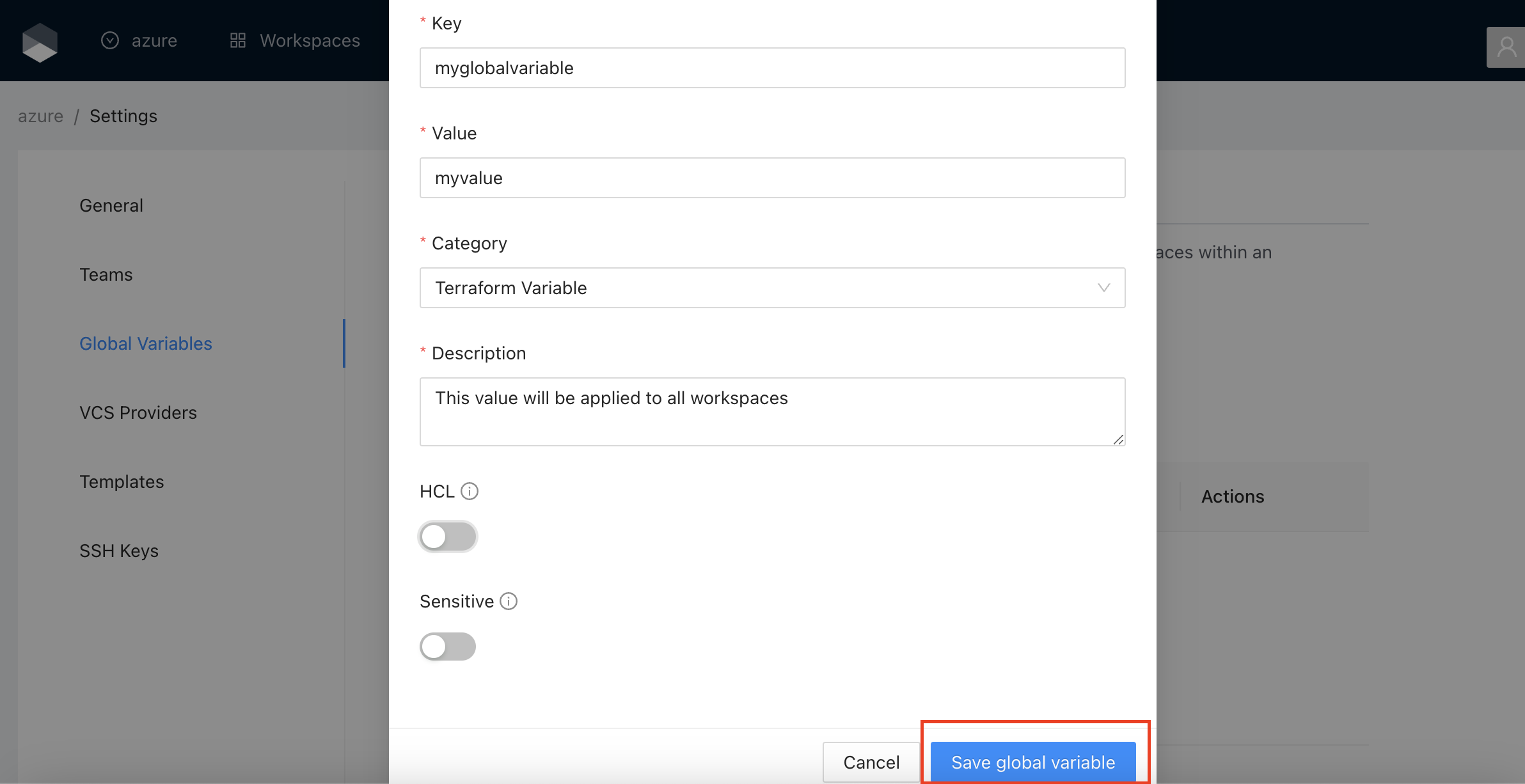 Global Variables allow you to define and apply variables one time across all workspaces within an organization. For example, you could define a global variable of provider credentials and automatically apply it to all workspaces.