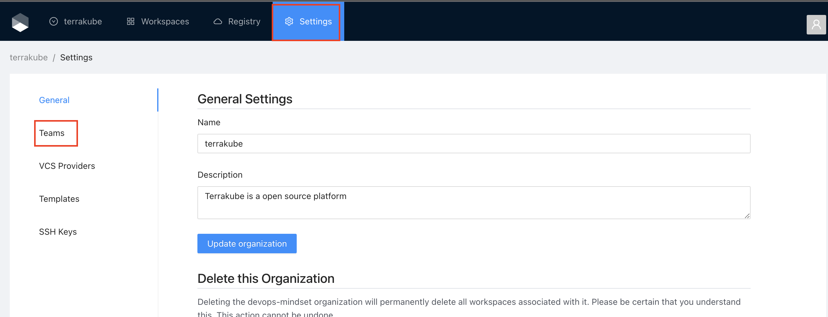Once you are in the desired organization, click the **Settings** button and then in the left menu select the **Teams** option.