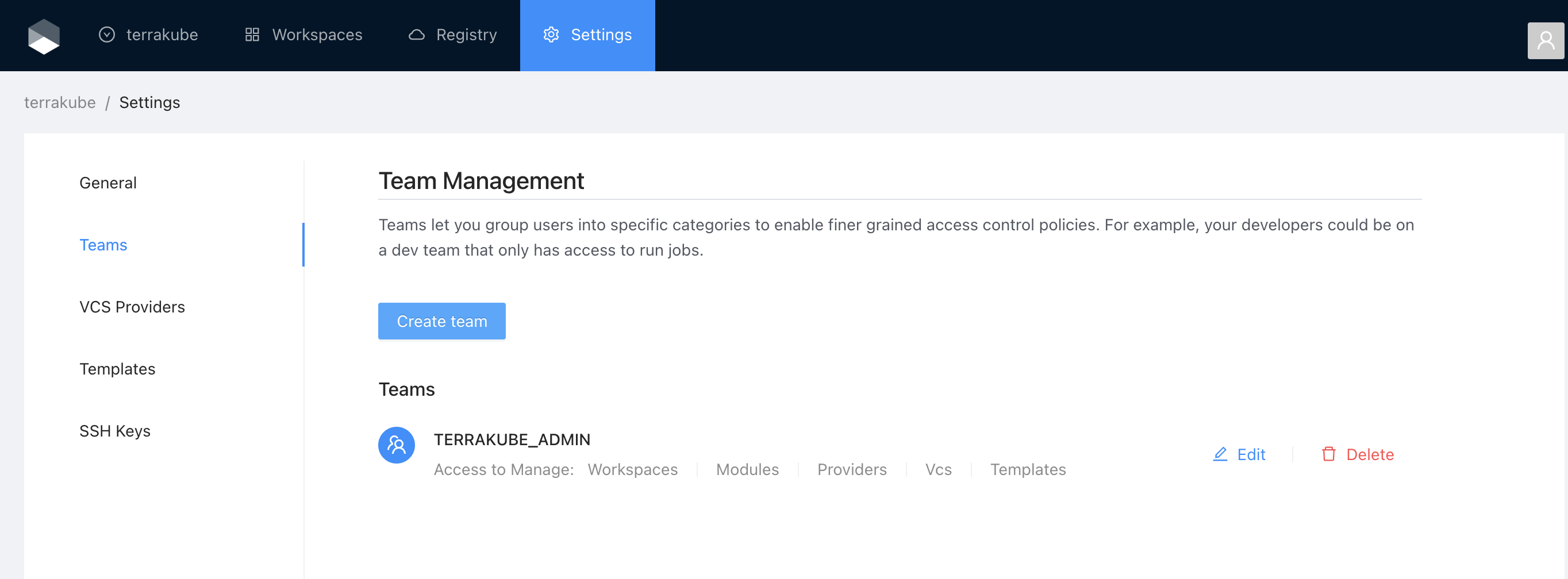 <table><thead><tr><th width="341">Field</th><th>Description</th></tr></thead><tbody><tr><td>Name</td><td><p>Must be a valid group based on the Dex connector you are using to manage users and groups.</p><p>For example if you are using Azure Active Directory, you must use a valid Active Directory Group like TERRAKUBE_ADMIN, or if you are using Github the format should be MyGithubOrg:TERRAKUBE_ADMIN</p></td></tr><tr><td>Manage Workspaces</td><td>Allow members to create and administrate all workspaces within the organization</td></tr><tr><td>Manage Modules</td><td>Allow members to create and administrate all modules within the organization</td></tr><tr><td>Manage Providers</td><td>Allow members to create and administrate all providers within the organization</td></tr><tr><td>Manage <a href="templates">Templates</a></td><td>Allow members to create and administrate all <a href="templates">templates</a> within the organization</td></tr><tr><td>Manage <a href="../vcs-providers">VCS Settings</a></td><td>Allow members to create and administrate all <a href="../vcs-providers">VCS Providers</a> within the organization</td></tr></tbody></table>