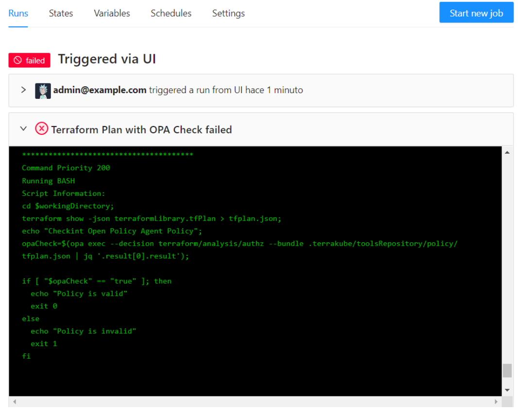 When you run this Terrakube job for this particular workspace you will see that the terraform policy is invalid and the job flow will failed.