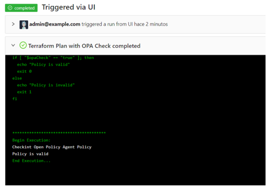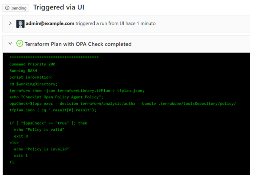 opaCheck=$(opa exec --decision terraform/analysis/authz --bundle .terrakube/toolsRepository/policy/ tfplan.json | jq '.result[0].result');