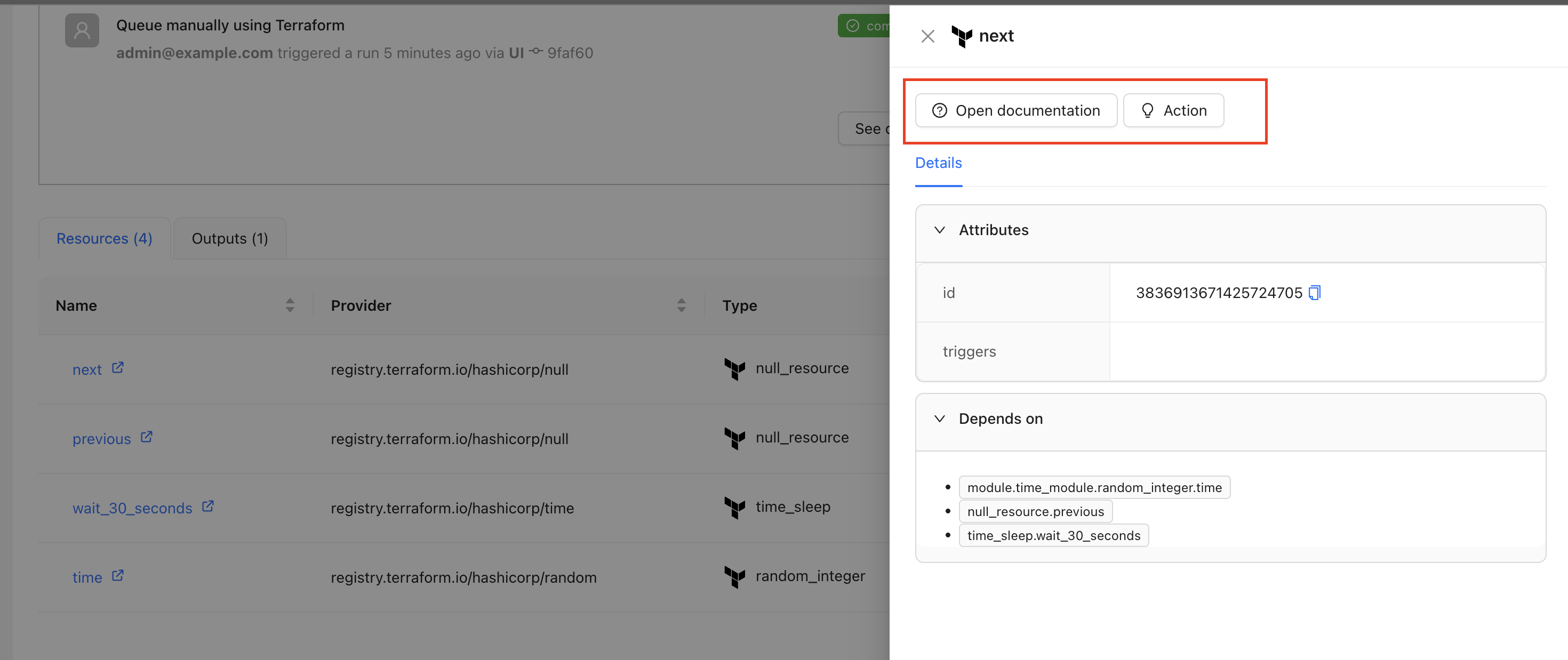 The action will appear for each resource when you click on a resource using the Overview Workspace page or the Visual State Diagram. Use this when an action applies to specific resources, such as restarting a VM or any actions that involve interaction with the resource. \