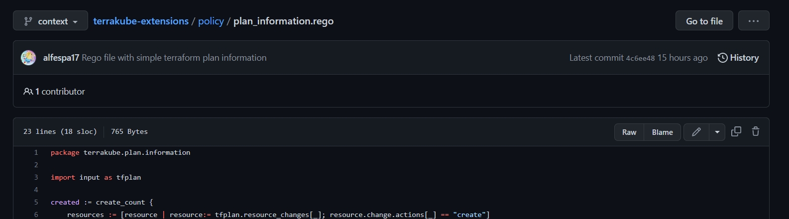 The firts step will be to create a small rego policy and add this to your Terrakube extensions repository inside the "policy" folder with the name "plan_information.rego", this is a very simple policy that will count the number of changes for a terraform plan.