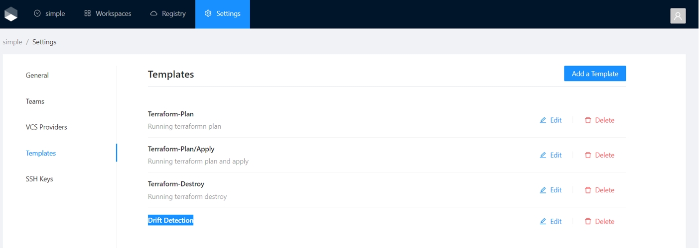 Now that you have define the template to detect the infraestructure drif you can add the template in your Terrakube organization using the name "Drift Detection"