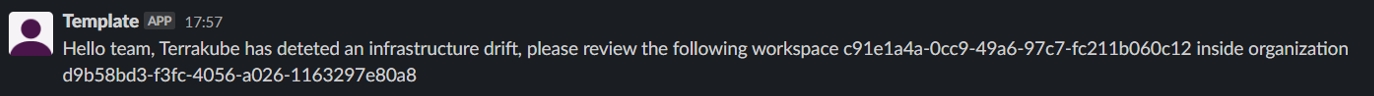 "Hello team, Terrakube has deteted an infrastructure drift, please review the following workspace $workspaceId inside organization $organizationId",