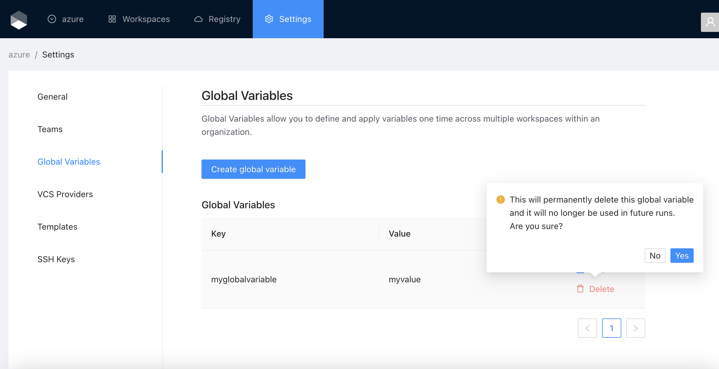 Click the **Delete** button next to the global variable you want to delete, and then click the Yes button to confirm the deletion. Please take in consideration the deletion is irreversible
