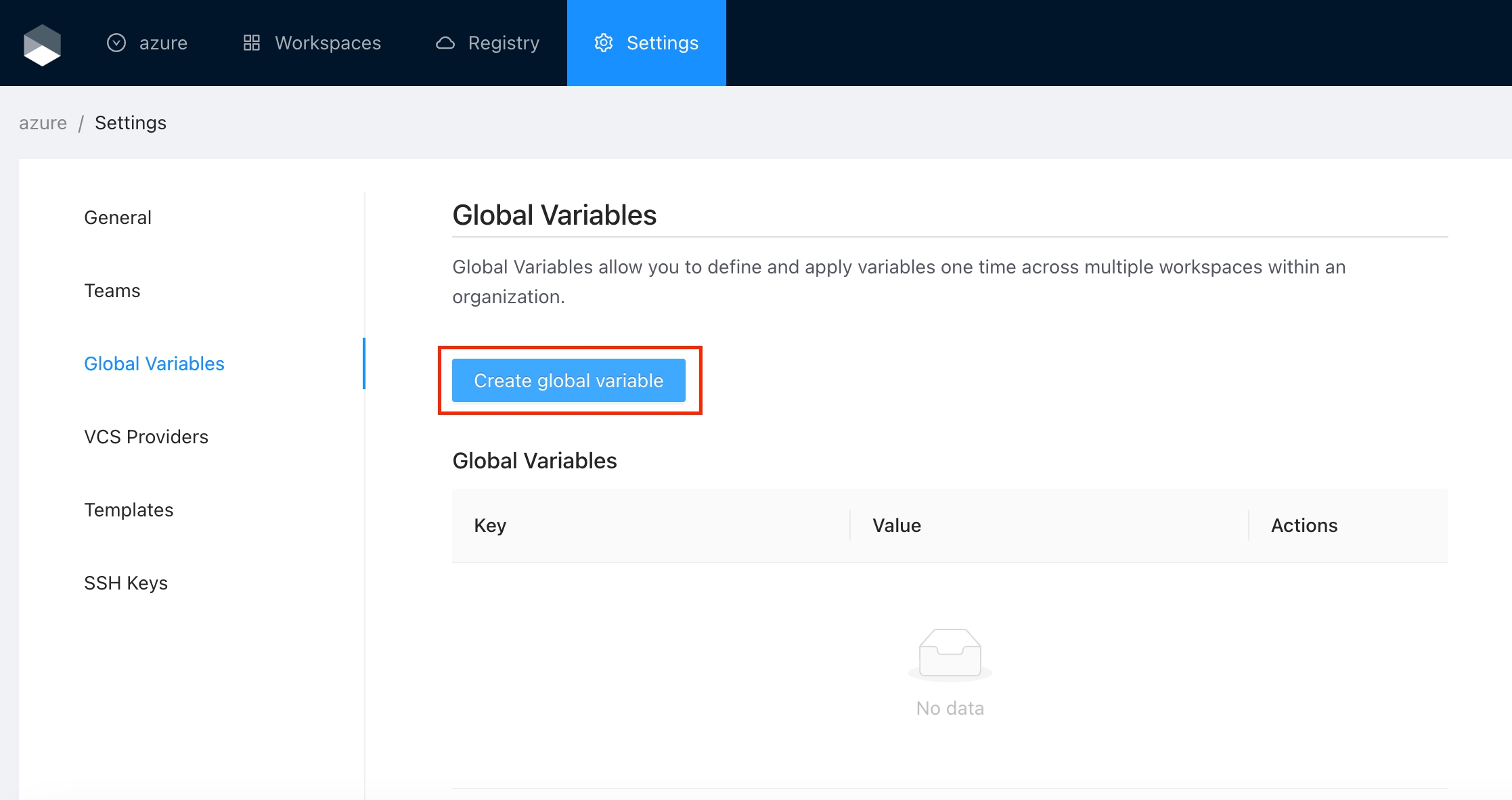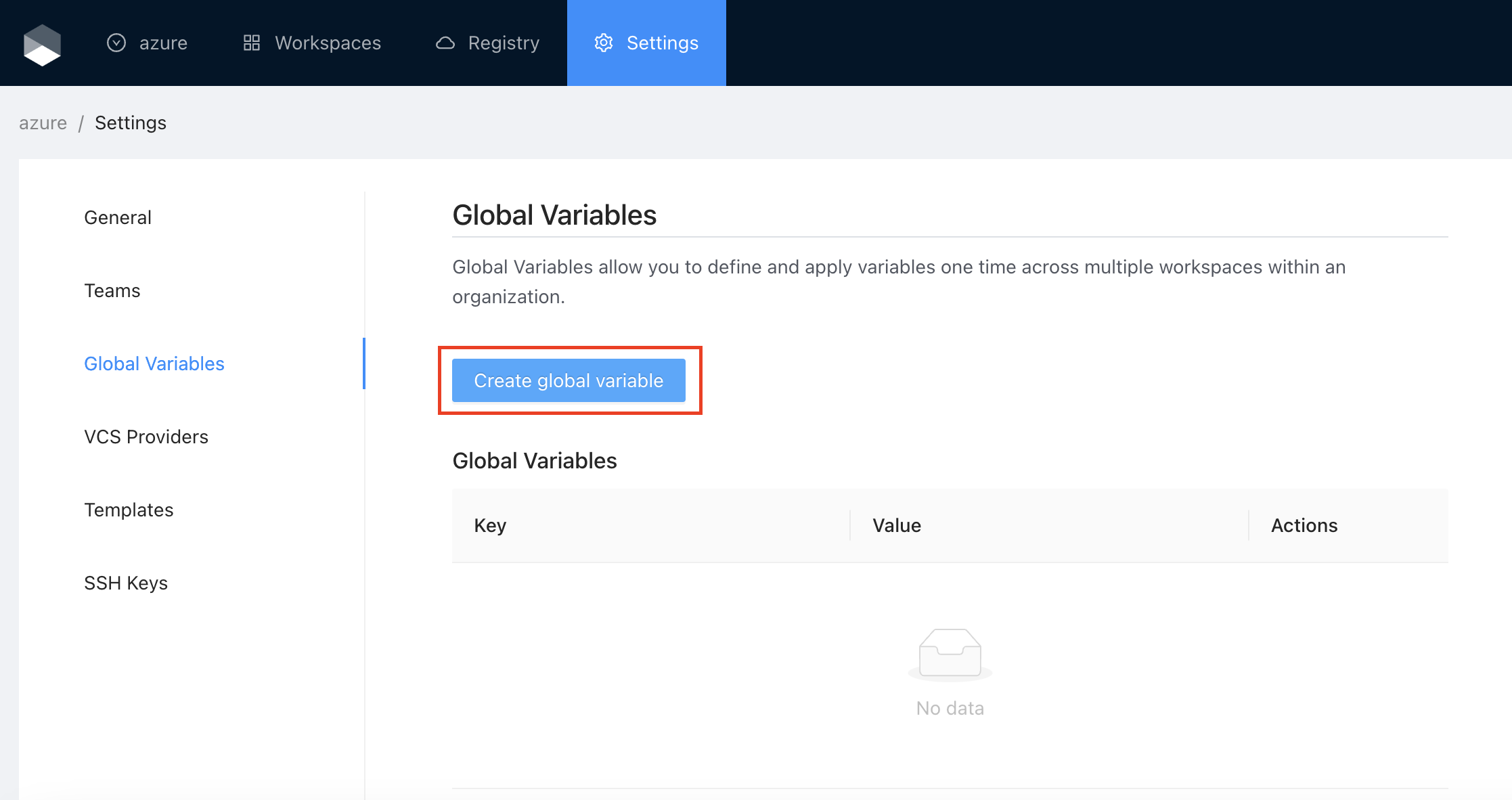 Global Variables allow you to define and apply variables one time across all workspaces within an organization. For example, you could define a global variable of provider credentials and automatically apply it to all workspaces.