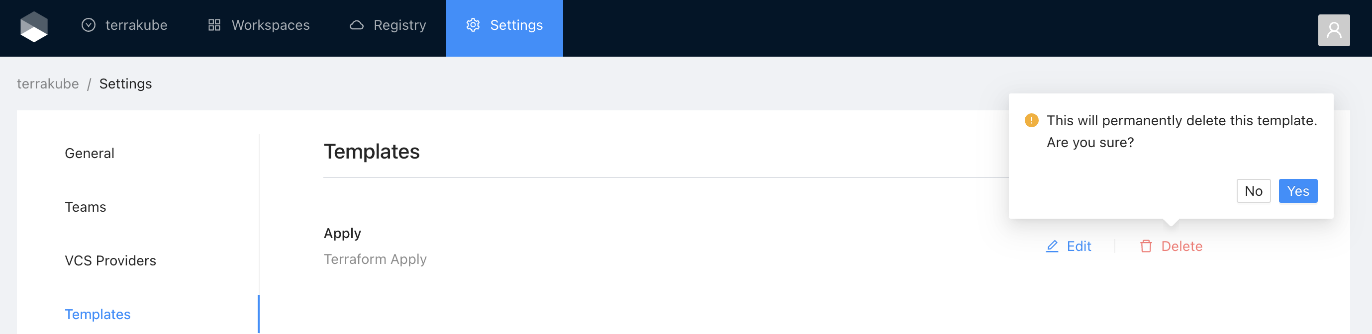Click the **Delete** button next to the Template you want to delete and then click **Yes** to confirm the deletion