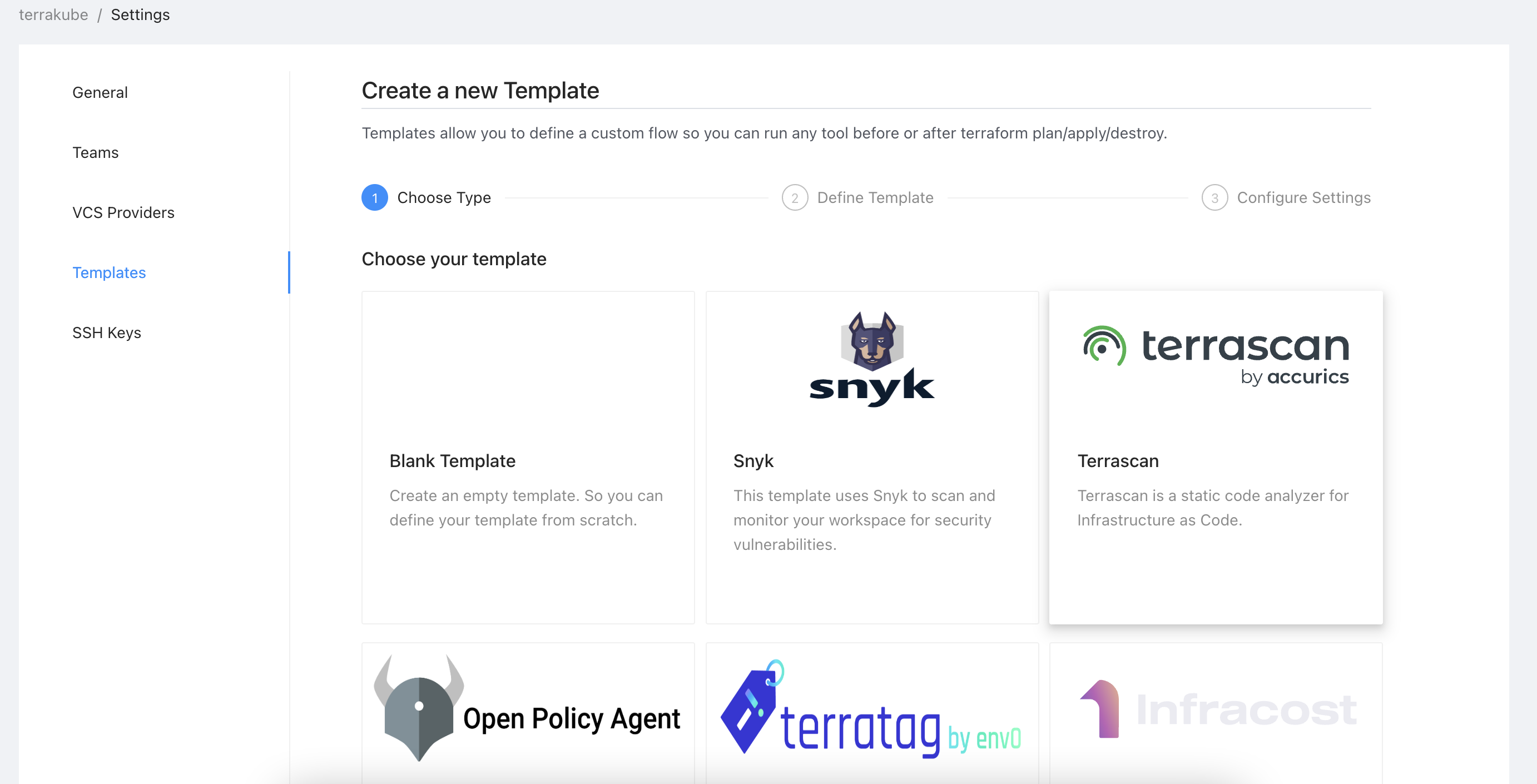 Using templates you can define all the business logic you need to execute in your workspace, basically you can integrate terrakube with any external tool. For example you can use [Infracost](https://www.infracost.io/) to calculate the cost of the resources to be created in your workspace or verify some policies using [Open Policy Agent](https://www.openpolicyagent.org/).