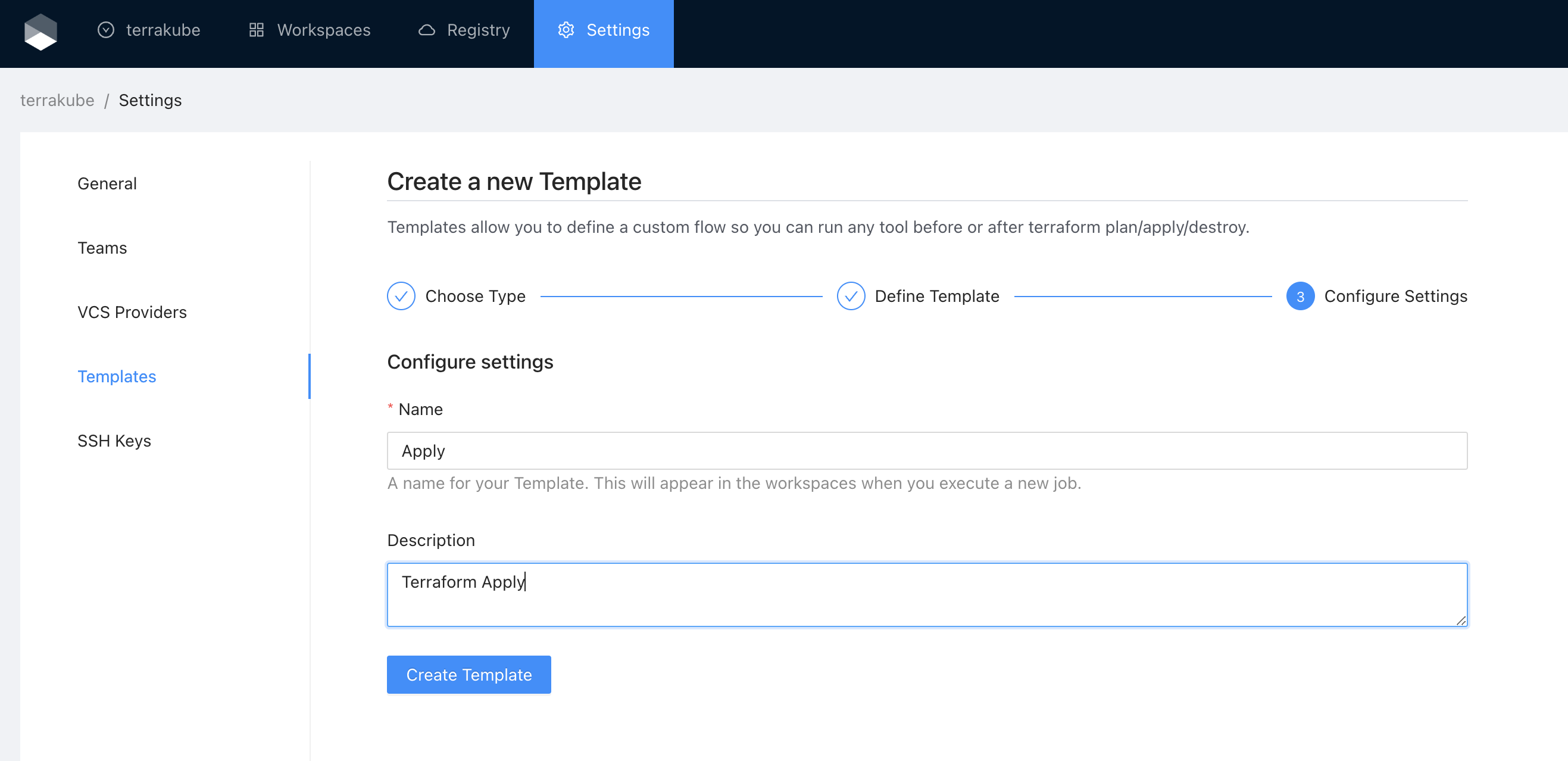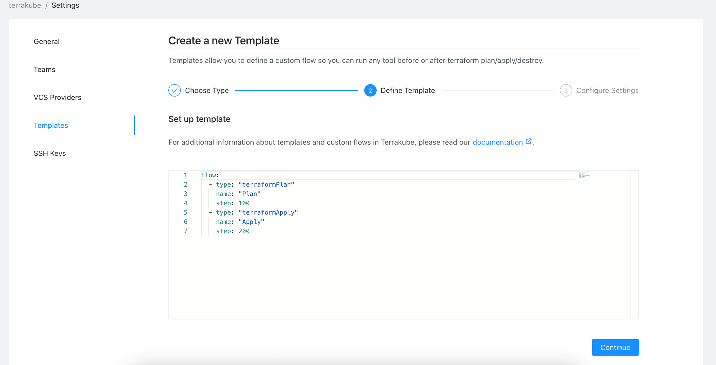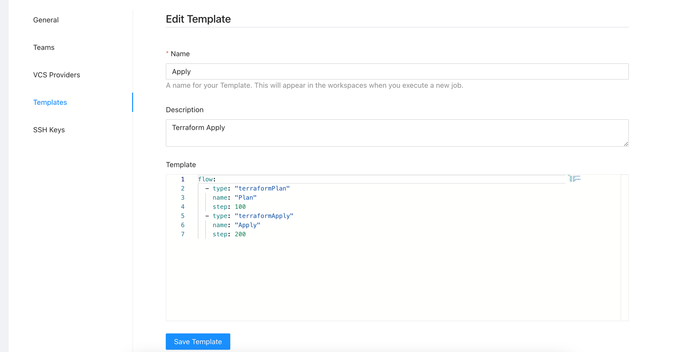 Templates allows you to customize the job workflow inside each workspace. You can define multiple templates inside each organization. Templates are written in yaml and you can specify each step to be executed once you use this template in the workspace. Lets see an example for a basic template: