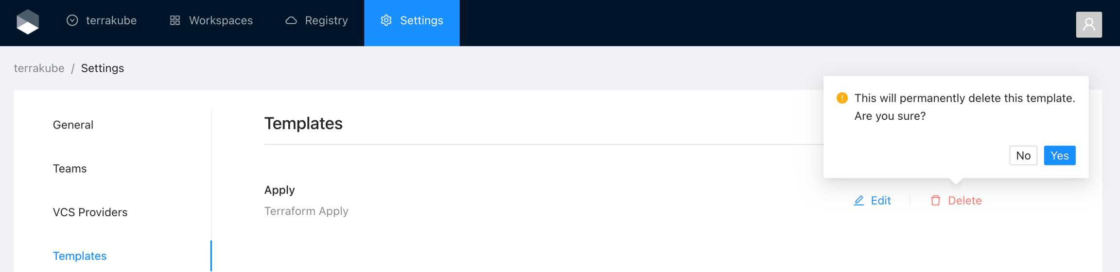 Click the Delete button next to the Template you want to delete and then click Yes to confirm the deletion