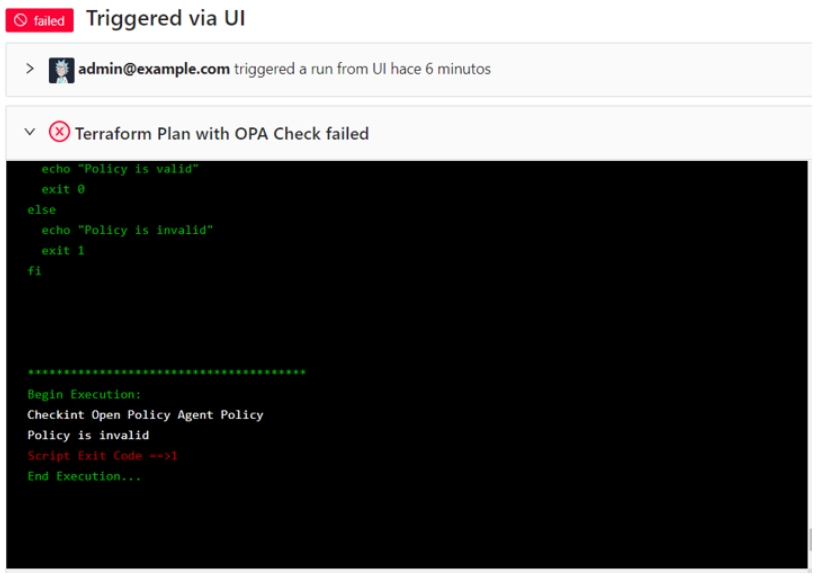 Once the Open Policy Agent has been imported successfully inside our Terrakube Job, you can make use of it to validate different terraform policies defined inside the Terrakube extensions repository that gets imported inside our workspace job using a simple BASH script. Based on the result of the policy you can difine if the job flow can continue or not.