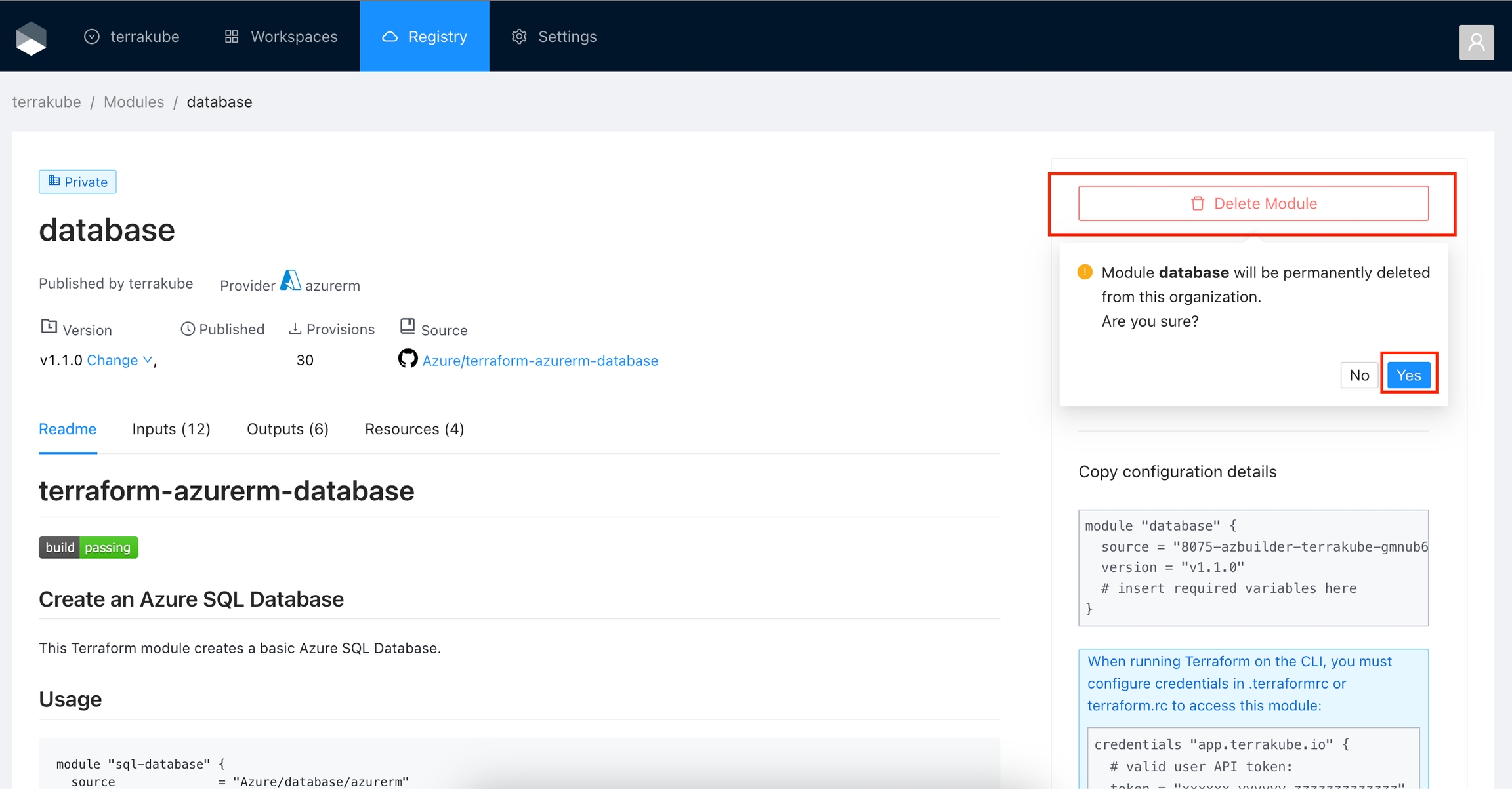 The module will be published inside the specified organization. On the details page, you can view available versions, read documentation, and copy a usage example.